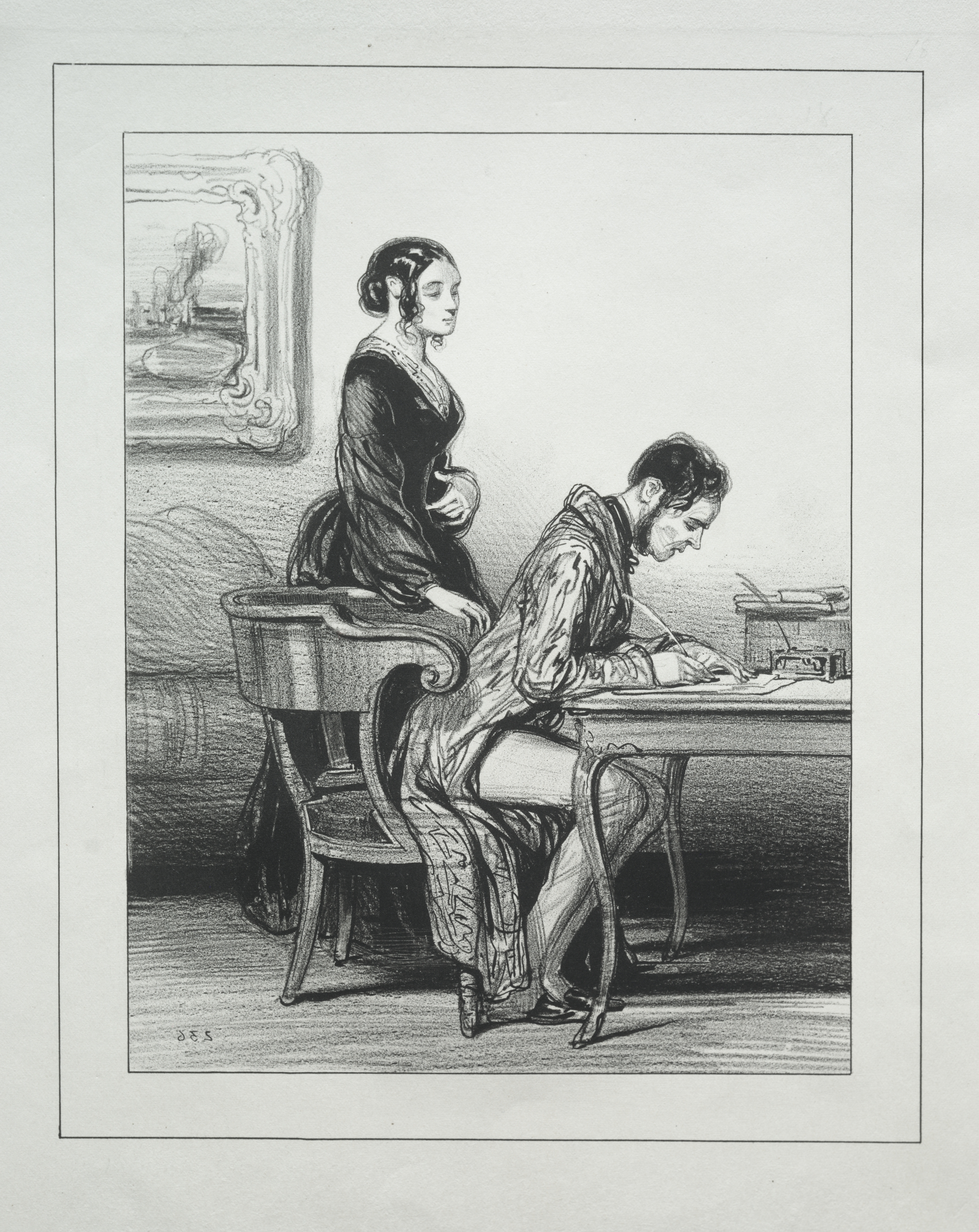 Black and white drawing of a man and woman indoors. The man sits at a table with his head down, writing on a piece of paper. He wears a collared shirt with billowy sleeves and pants. A woman stands beside him, leaning on the back of a chair. She wears a dark dress. A wall with a hanging picture is in the background. The picture is titled "Fourberies de Femmes" and was created by Paul Gavarni.