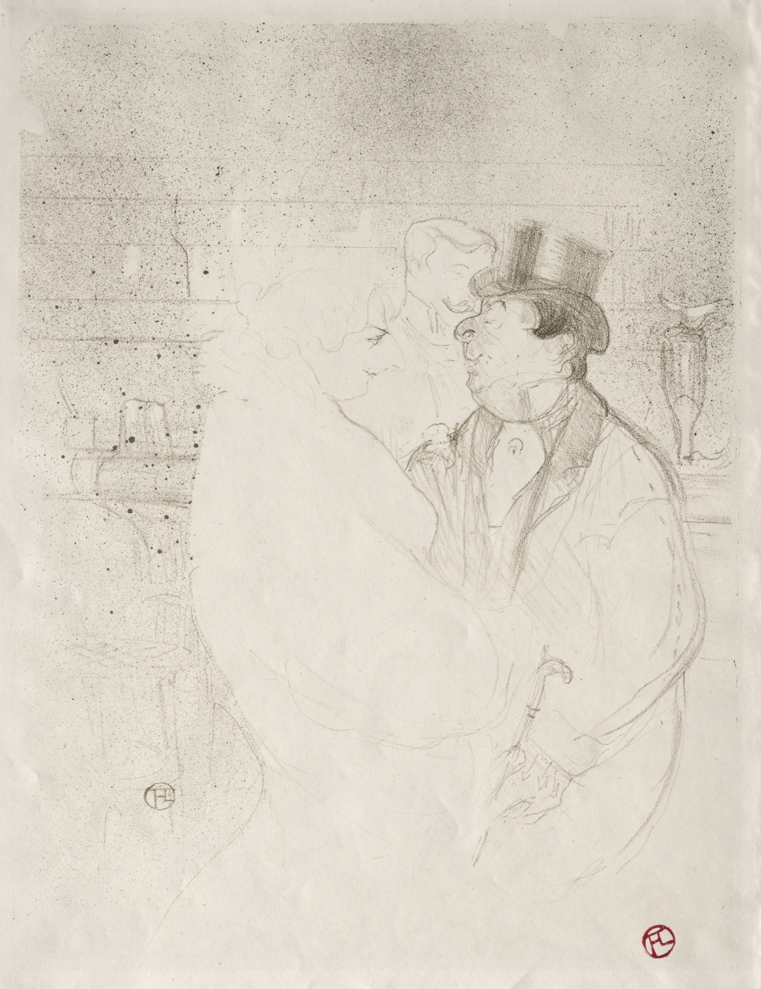 The image depicts a black and white sketch of a man and woman. The woman wears a low necked, puffy sleeved dress. She has her head tilted back and her mouth open toward the man. The man on the right wears a top hat and holds a cane in his left hand. The man has a mustache and is wearing a coat over a vest and a collared shirt with a bow tie. His facial expression appears to be one of smiling. The background appears to be an interior scene with a wall. Small dark spots are scattered on the image. The drawing presents a somewhat ghostly appearance. A circular signature appears in red ink. The image appears to be printed on aged paper.