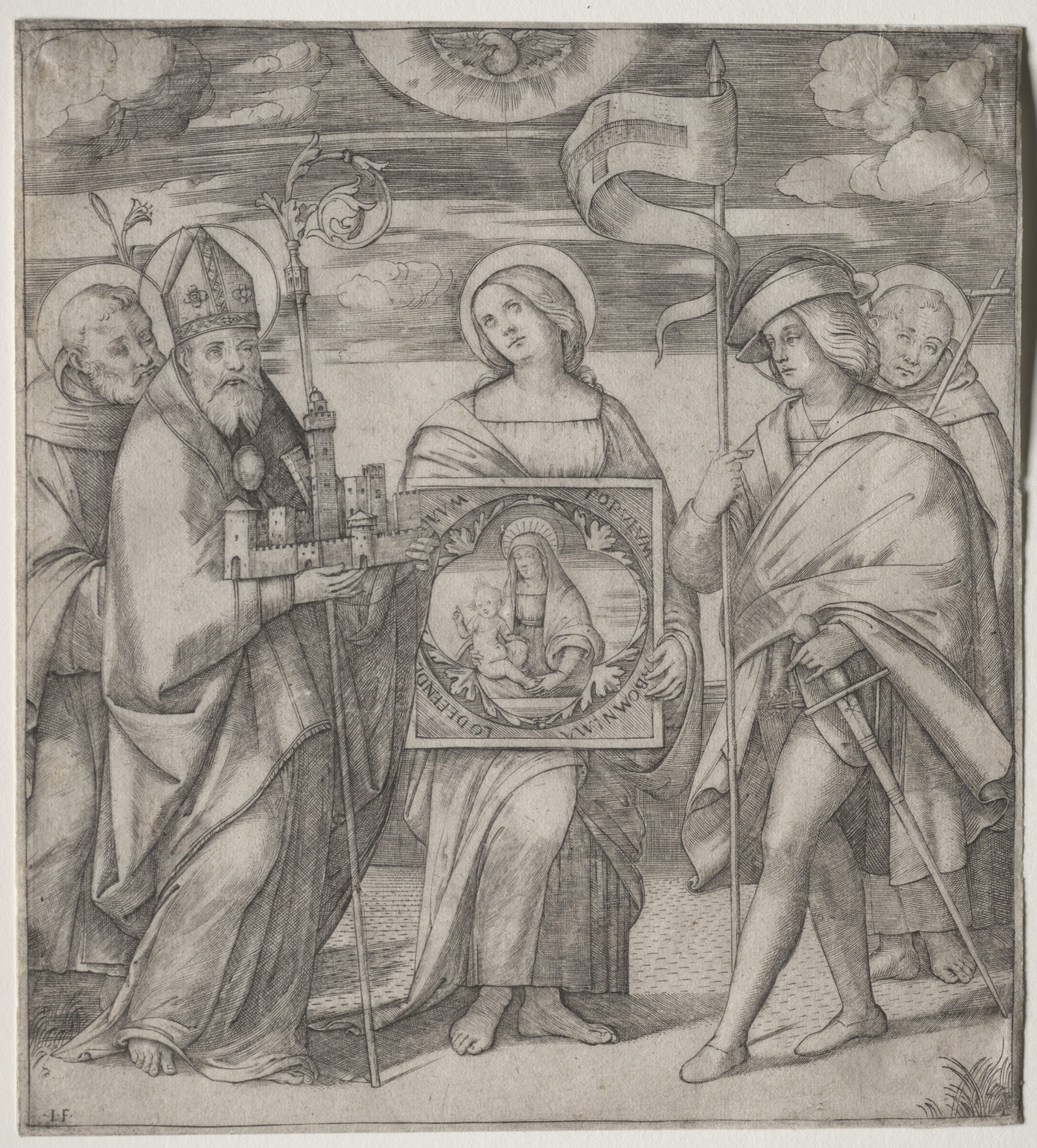 The image depicts a black and white drawing of a group of people. A woman stands in the center holding a framed image. She wears a long dress and a head covering. The frame she holds depicts a woman holding a baby. To her left, a man in a long robe and a tall mitre hat holds a staff and a model of a city. He is accompanied by another man in a robe. To her right, a man in a short hat and a cloth wrapped around his body holds a staff with a flag on it. He is accompanied by another man behind him, who carries a cross and wears a robe. The background shows a cloudy sky with the sun peeking through. The overall mood suggests a religious scene. The image is titled "Patron Saints of Bologna" and is by Giacomo Francia.