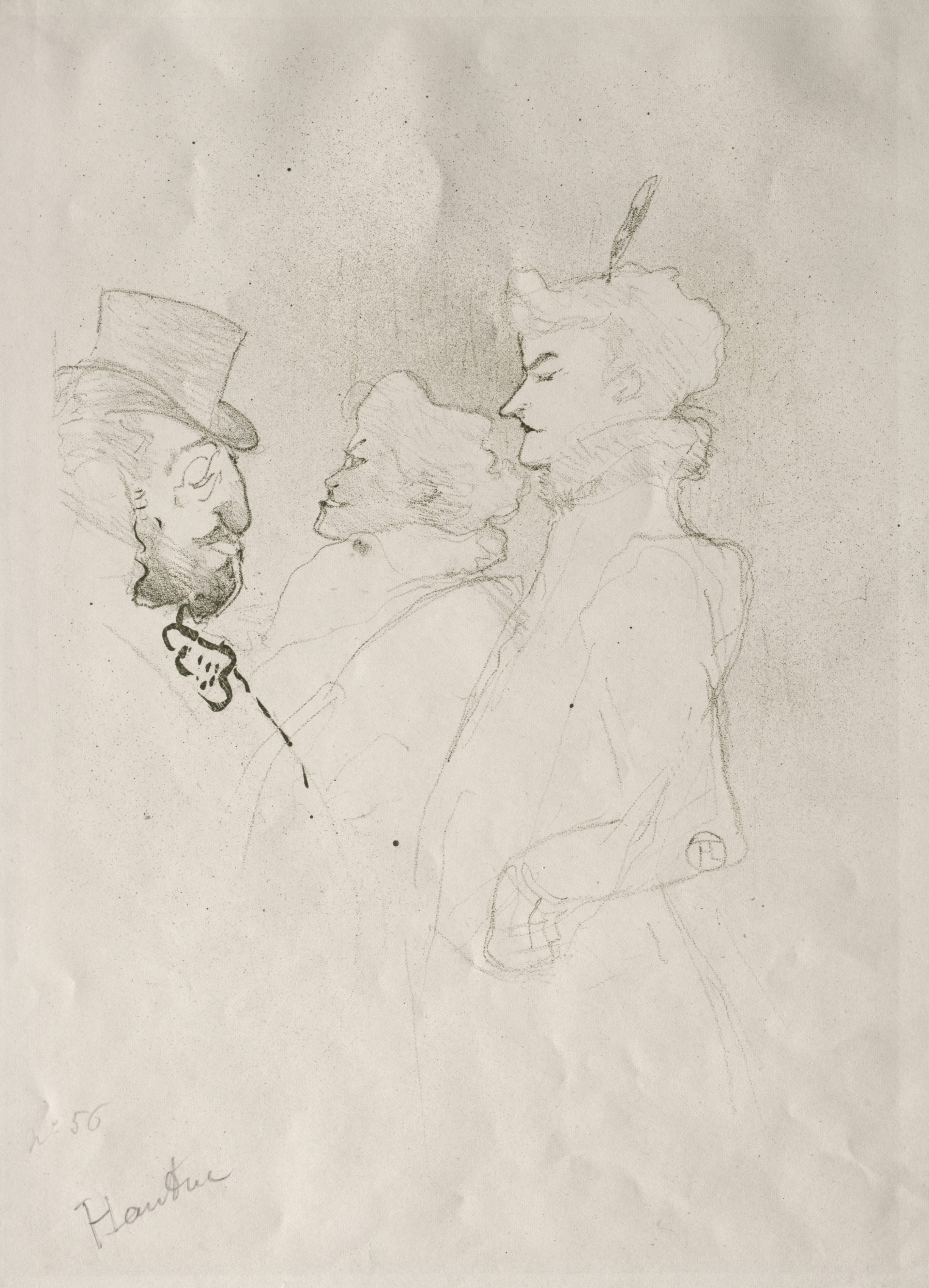 The image shows a sketch of three people. The man on the left has a beard and mustache and is wearing a top hat. He is facing a woman who is in profile facing right. She is wearing a dress. On the right is a man with a quill behind his hair, facing left. The background is a light gray color with darker shading around the figures. The sketch appears to be done in pencil. The artist's signature is in the bottom-left corner. The overall tone of the image is monochromatic.