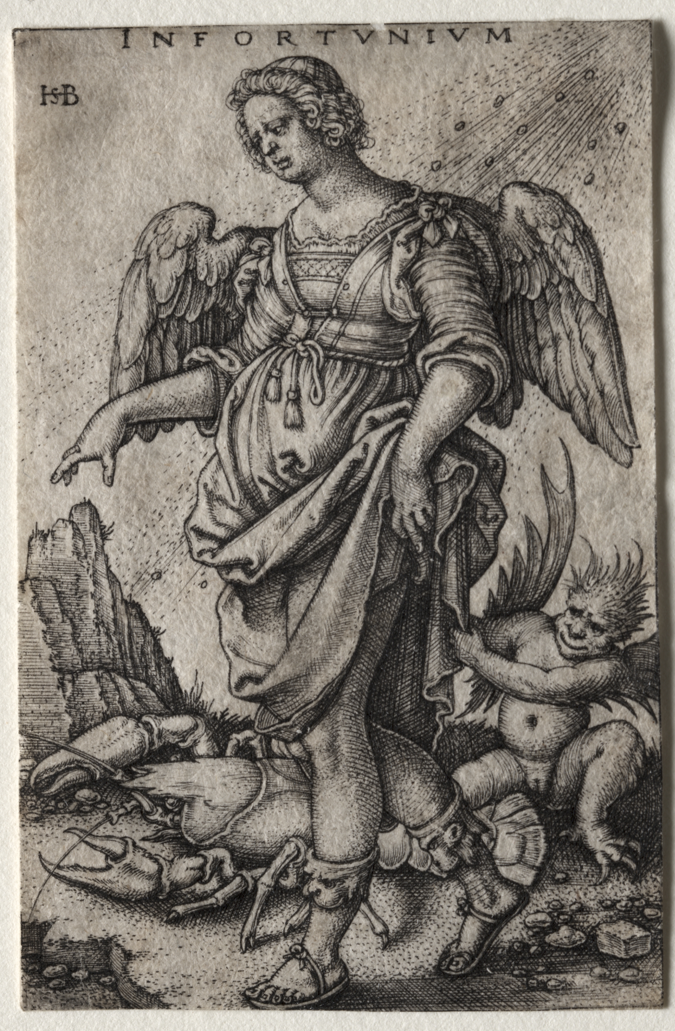 Black and white image of a standing female figure with wings on her back, likely an angel. She has curly hair, wears a long dress and sandals with straps. Her left arm is down by her side while her right arm extends outward. She stands over a fallen horned creature, possibly a demon or devil. A smaller similar creature crouches behind her on the right. Text at the top reads "IN FORTVNIVM". The background shows various textures and shading. The image is titled "Misfortune" and by artist Hans Sebald Beham.