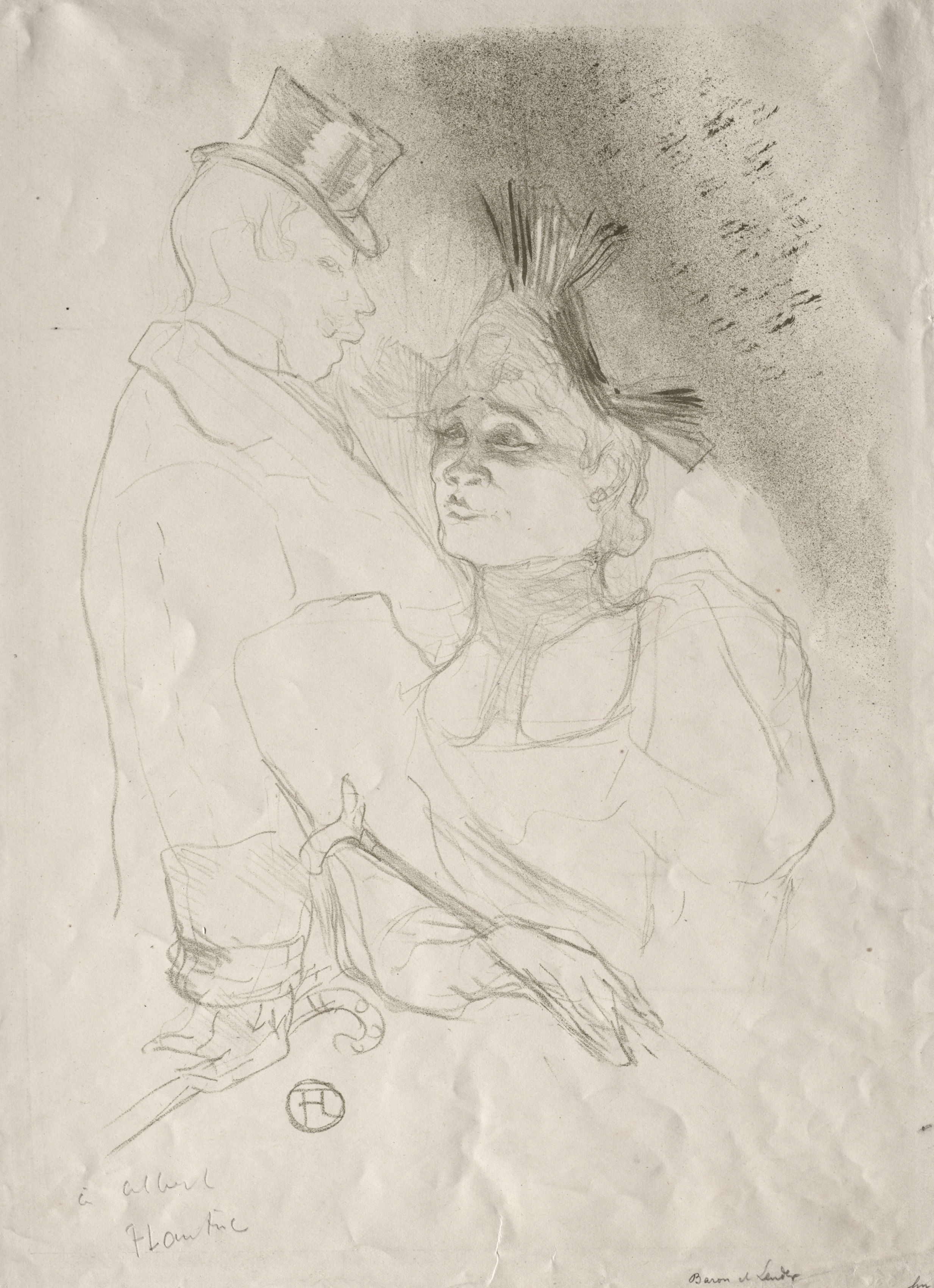 The image displays a sketch of a man and a woman. The man, on the left, faces right; he wears a top hat and a light jacket. The woman, on the right, faces forward and slightly left; she wears a headdress with feathers and a light dress. The background is a gradient of light to dark shading, and the paper appears wrinkled. The artist's signature appears at the bottom. The title of the piece is "Lender and Baron" by Henri de Toulouse-Lautrec.