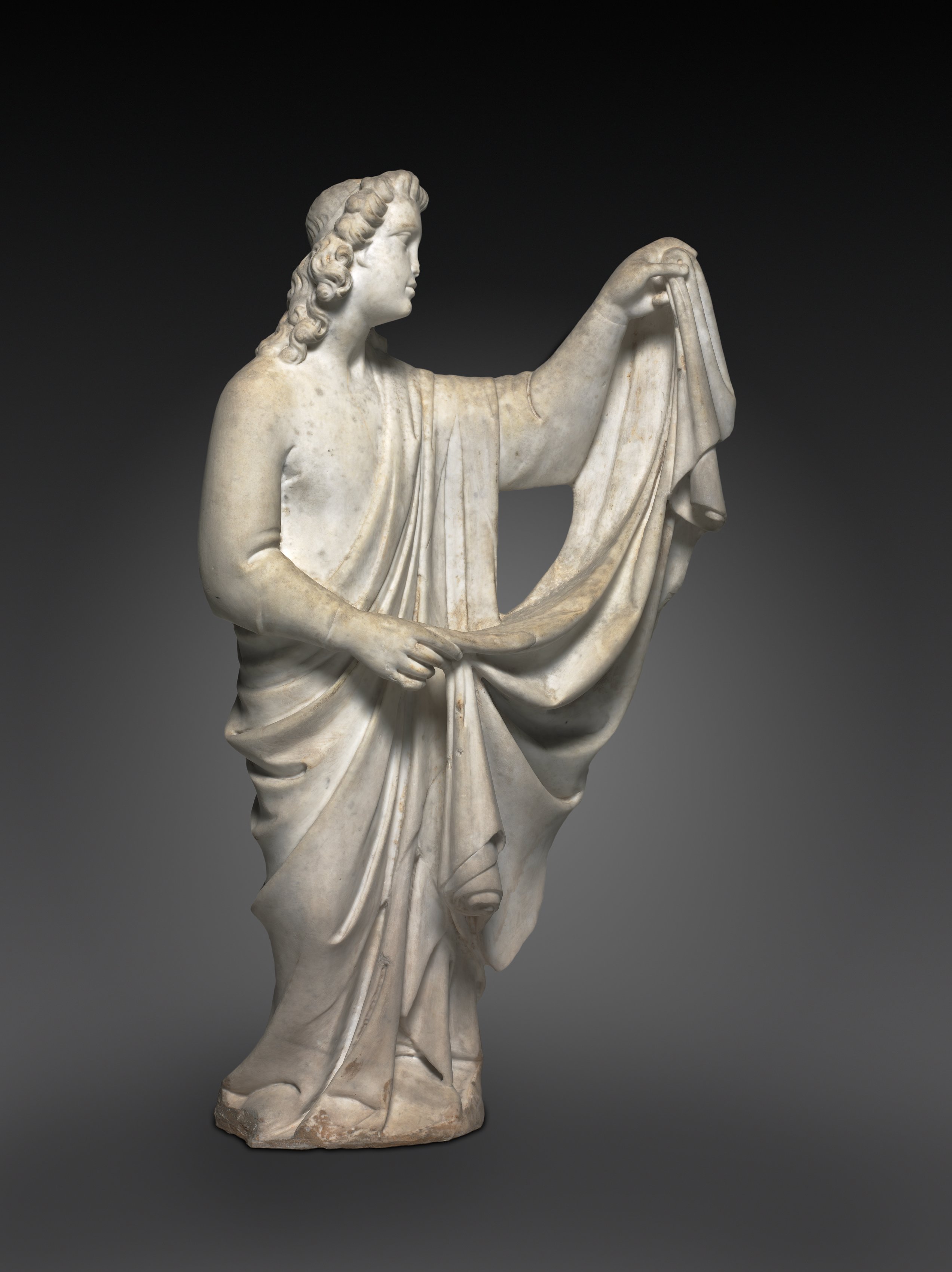 The statue depicts a woman with curly hair wearing a long, draped garment. She is holding fabric in both hands. The woman's body is turned to the right, with her head facing the right side. Her left arm is bent at the elbow, and her right arm is also bent at the elbow. The statue appears to be made of white marble. The background is dark gray, with a lighter gray gradient around the statue.