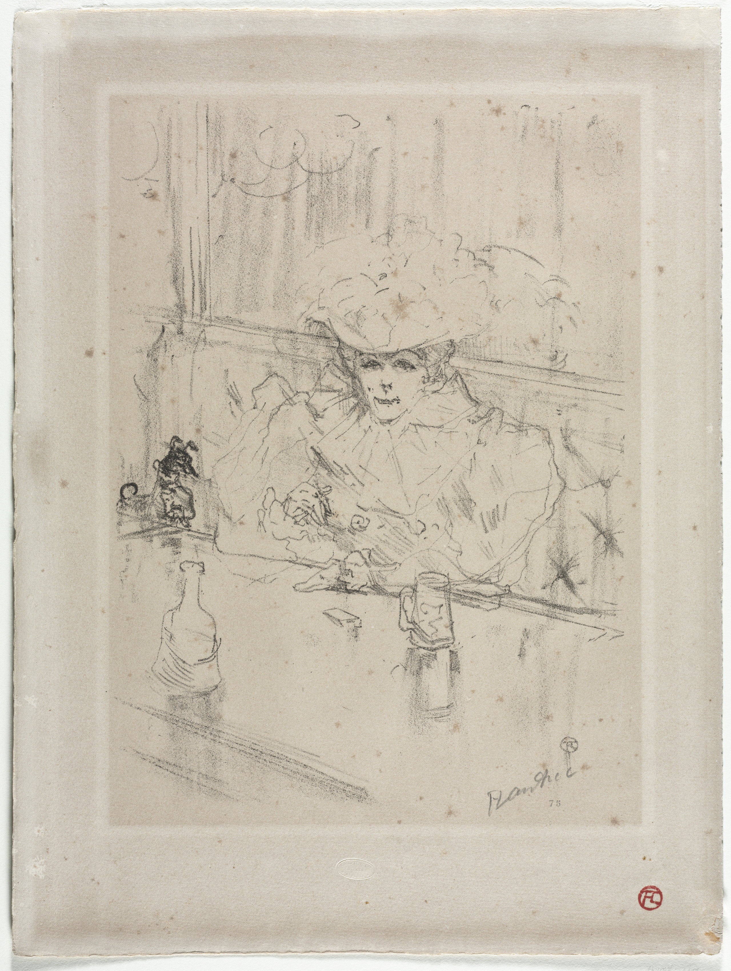 The image depicts a sketch of a woman sitting at a table. The woman wears a large hat. She sits turned slightly to her left. Her right arm rests on the table; her left arm is obscured. A bottle and a mug are on the table. The background includes vertical lines suggesting a wall or curtain, and there are some indistinct objects on a shelf behind her. The sketch is signed in the bottom right corner. The artwork is titled "In the Hanneton" by Henri de Toulouse-Lautrec. The paper is aged and has a rough texture. A red stamp is in the bottom-right corner.
