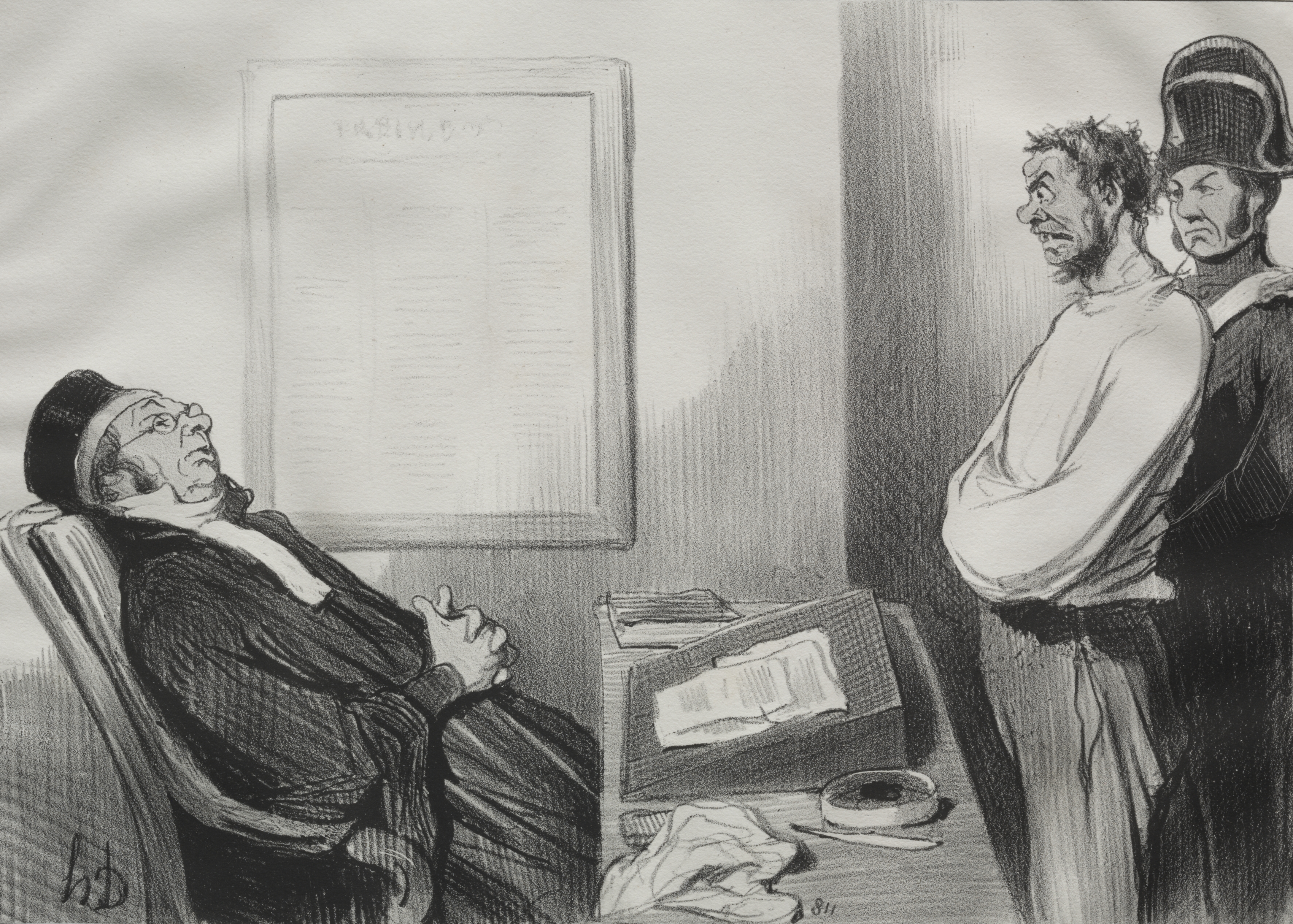 Black and white drawing. A man sits reclined in a chair on the left. He wears a dark robe with a white scarf around his neck and a black hat. His head is tilted back and he looks up, the whites of his eyes showing. His hands are folded. There is a table to his right. On the table are a briefcase, an ashtray and spoon, and a crumpled piece of fabric. A framed piece of paper hangs on the wall. Two men stand on the right. The man on the right wears a military-style dark uniform and a tall hat. He holds the man on his left from behind. The man on the left wears a white shirt and pants. He has a disheveled look, with a beard and messy hair. He looks down and to the left.