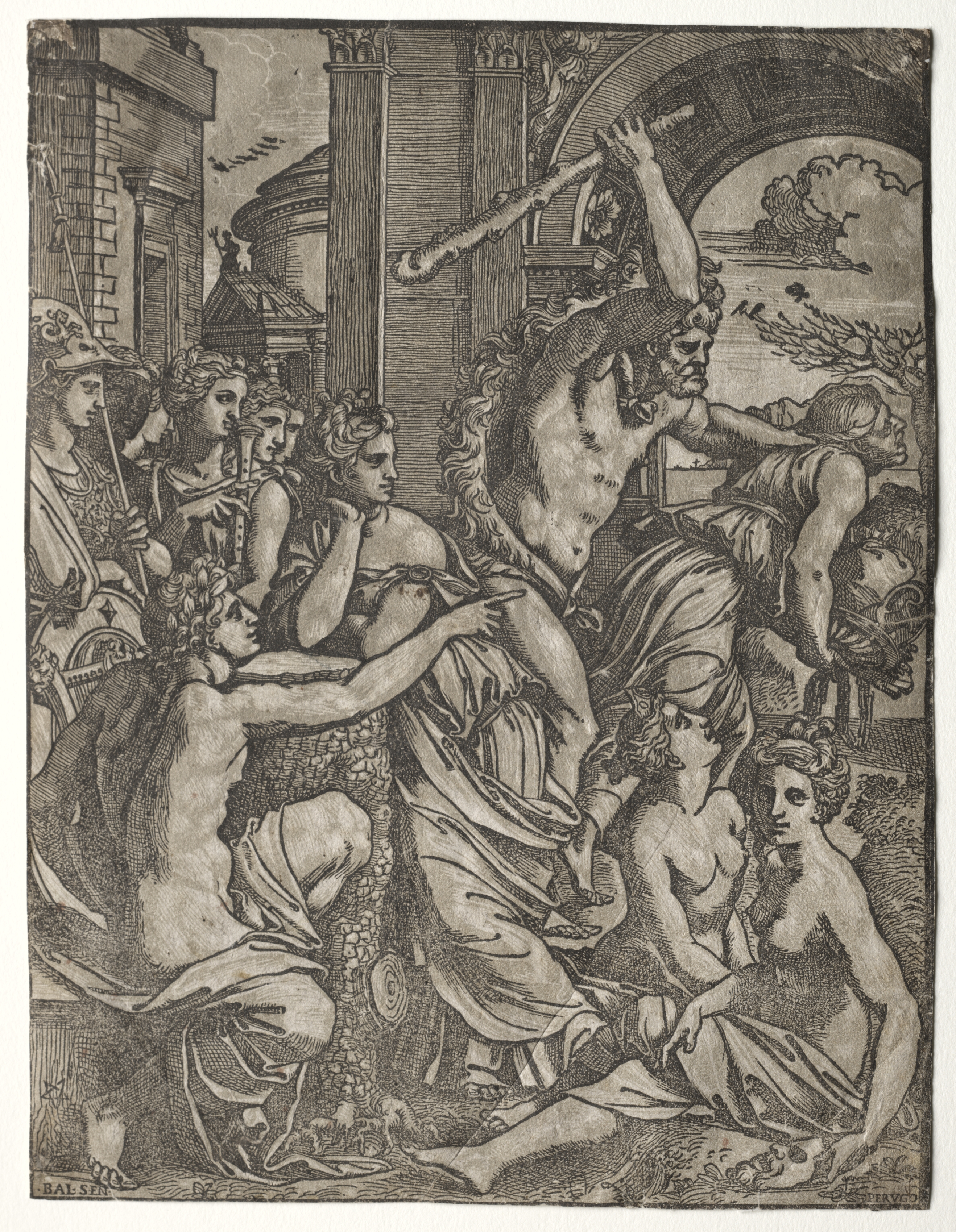 Black and white image. A muscular man wearing a cloth wrapped around his waist holds a club. He appears to be pushing or pulling a figure to the right. He has long hair and a beard. A group of seated and kneeling people surround him, some with musical instruments. The people are wearing togas. A building with columns and an archway are behind them. A domed structure appears in the background. The sky has clouds.