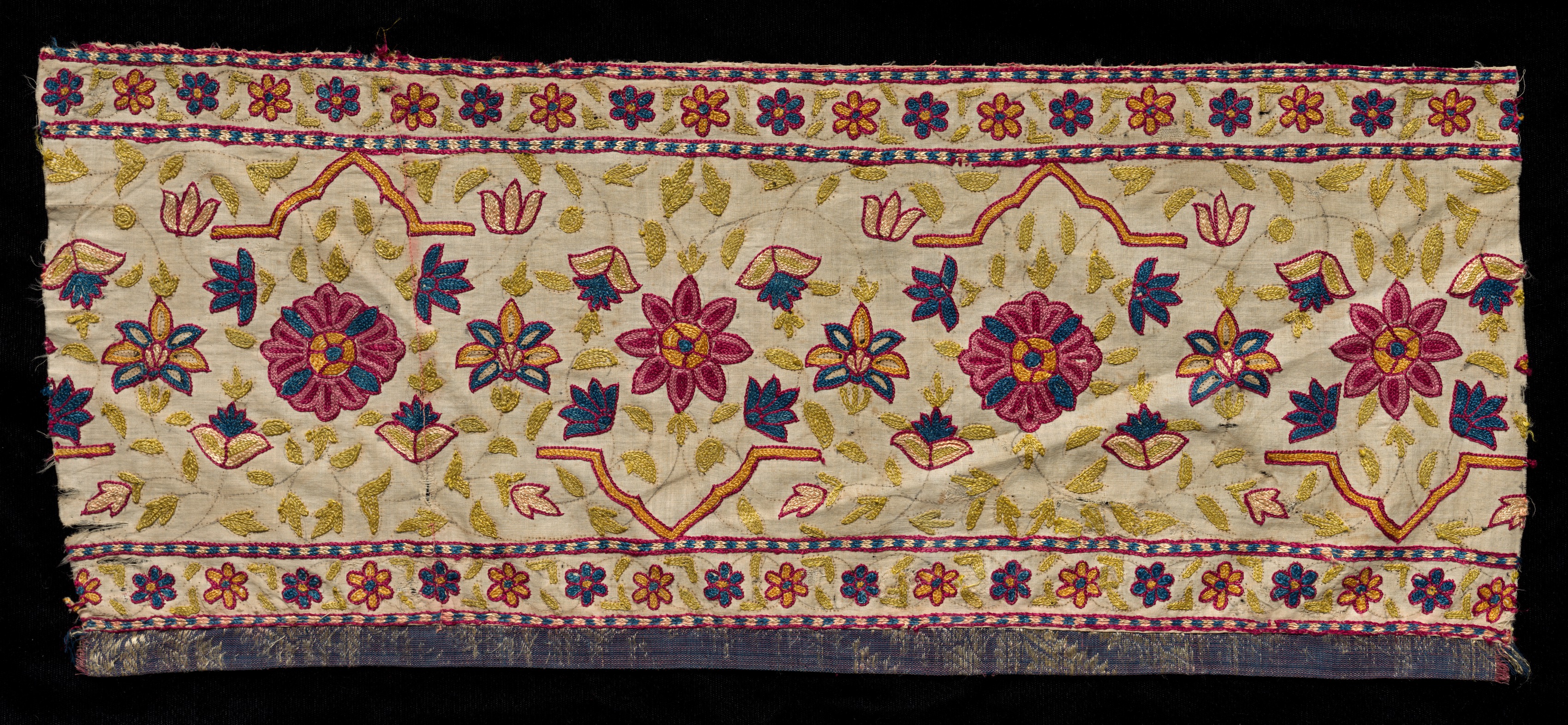 Beige rectangular textile with a floral pattern. The textile has a thick horizontal border at the top and bottom. The top border consists of two lines: - The top line contains small flowers in blue, orange, pink and purple. - The second line contains a repeating pattern of orange shapes resembling abstract mountains. The bottom border consists of three lines: - The top line matches the top border's flower line. - The middle line matches the top border's mountain line. - The bottom line is a dark blue band with a gold leaf pattern. The main body of the textile features: - Large pink flowers with blue centers and petals - Smaller blue, orange, and pink flowers - Green leaves The background is black. Title: Fragment Artist: Unspecified.