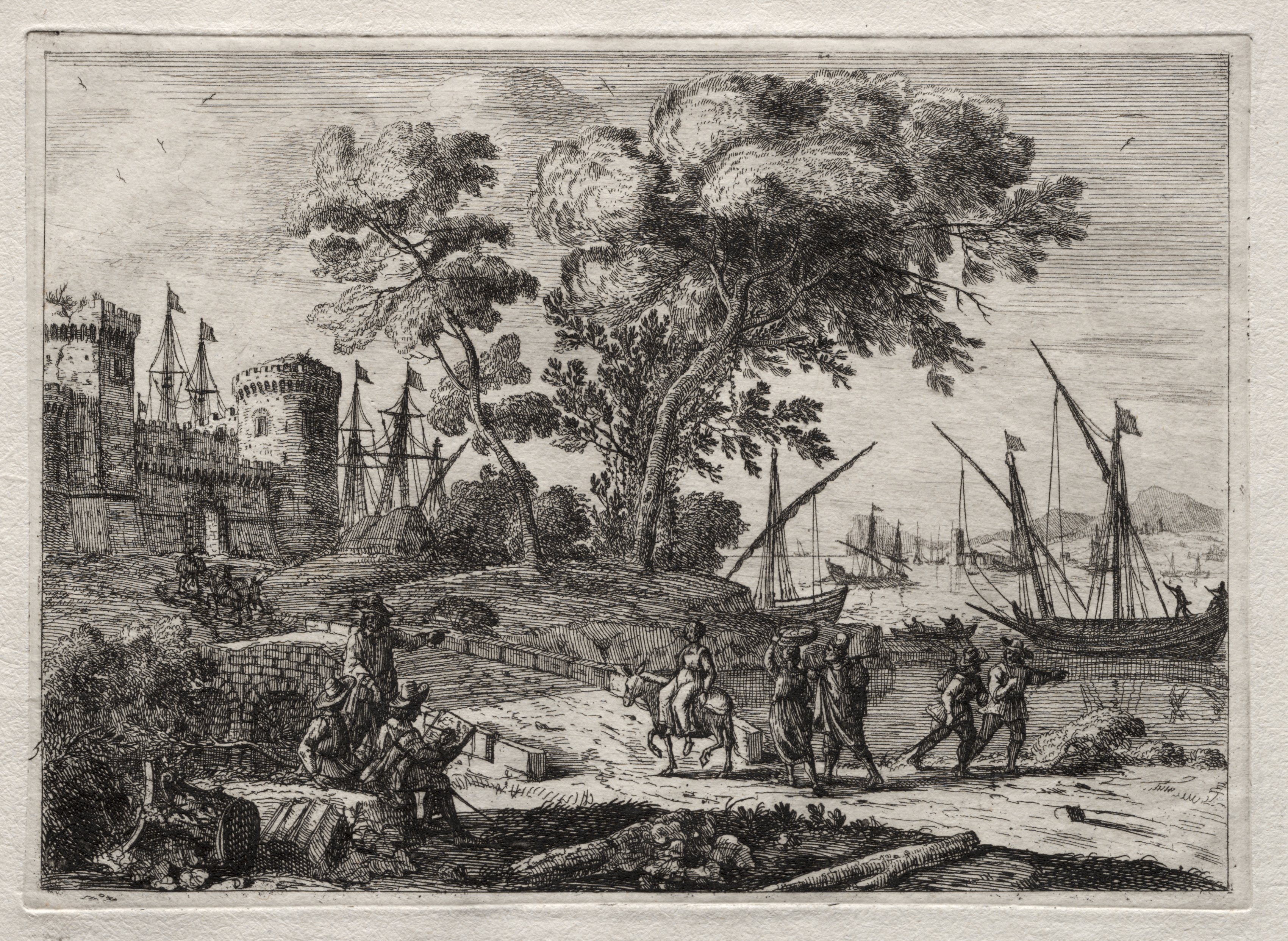 The Draughtsman by Claude Lorrain: A black and white etching depicting a landscape scene. A large tree with sprawling branches and leaves is centered. In the background, to the left, is a fortress or castle with a short wall and tower. Several sails and masts of ships are visible to the right. A group of people are gathered on the shore; one person rides a horse. A man sits on a low wall on the left. The image is framed by a thin border.