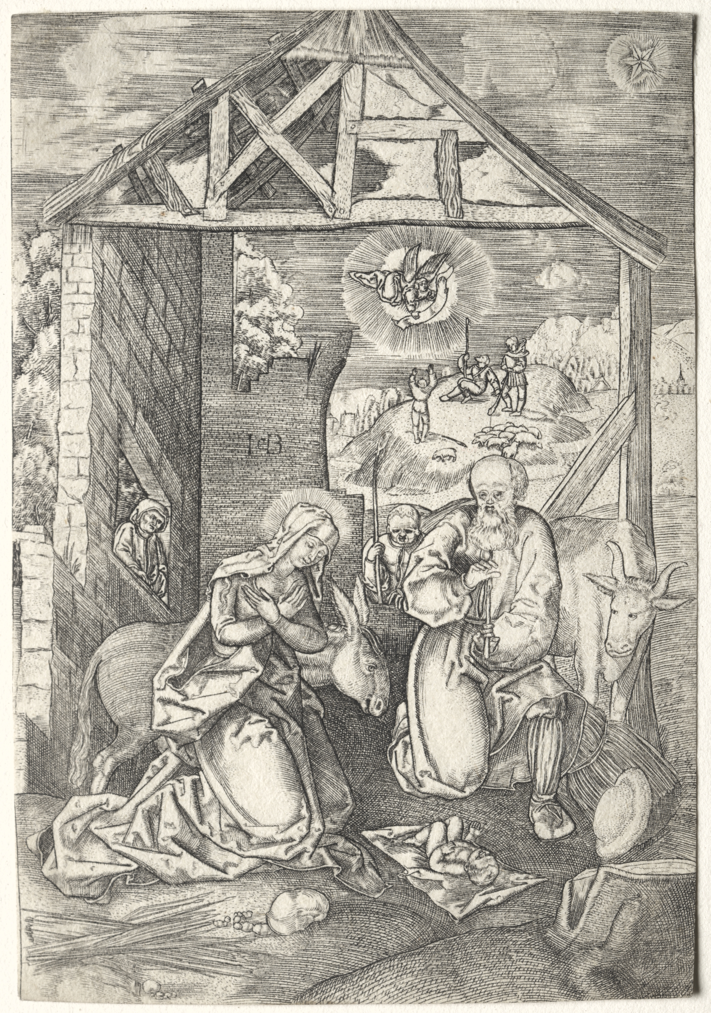 The Nativity by Jacob Binck. Black and white image. A roofed stone structure with a triangular roof. The roof has wooden beams forming an A-frame. A woman kneels on the left. The woman wears a long dress and a head covering. The woman's hands are clasped in prayer. The woman's face is tilted down. A man sits on the right. The man wears a long robe. The man has a long beard and balding hair. The man holds a staff. A donkey stands beside the woman. A cow stands beside the man. A baby lies on a cloth in front of the woman. The background shows people in a field. An angel with wings flies above. The angel shines a halo of light. The sky has clouds. The image has detailed linework.