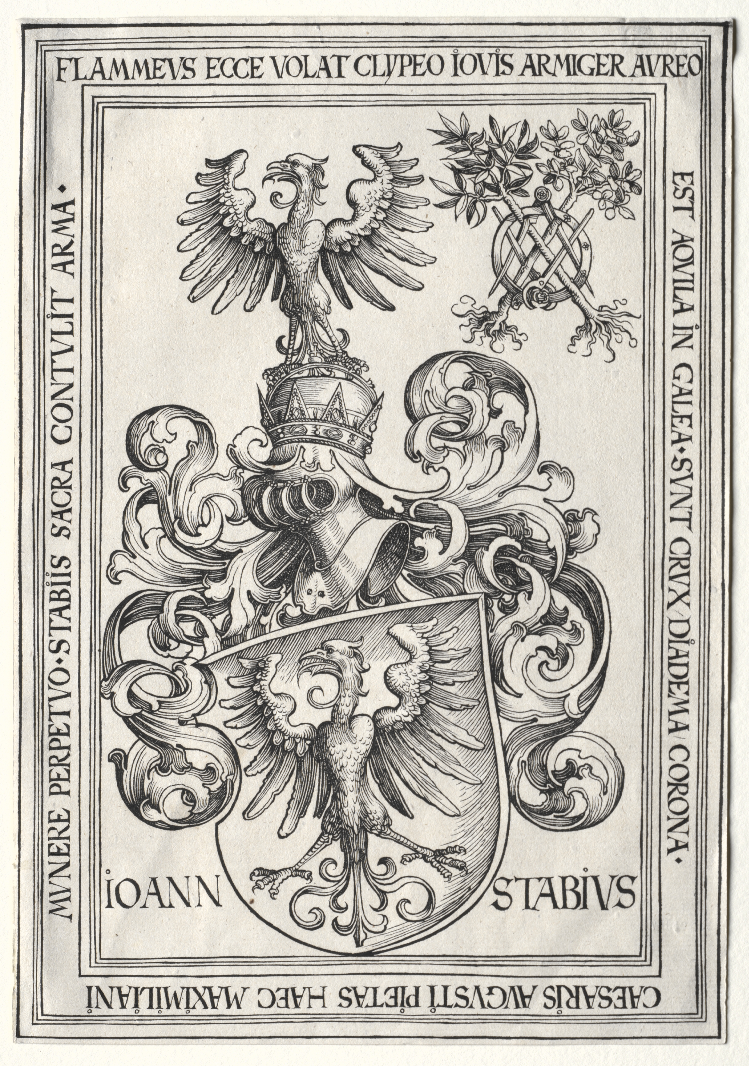 The image shows a black and white coat of arms with the name "Johann Stabius" and the artist "Wolf Traut". The coat of arms has a shield with a double-headed eagle on it. The double-headed eagle has its wings spread out and is facing outward. Above the shield is a crown with a bird on top, possibly an eagle. To the right of the bird on top of the crown is an image of a plant with flowers and leaves. The shield is surrounded by decorative swirls. There are Latin words written around the border of the coat of arms. The background of the image is off-white.