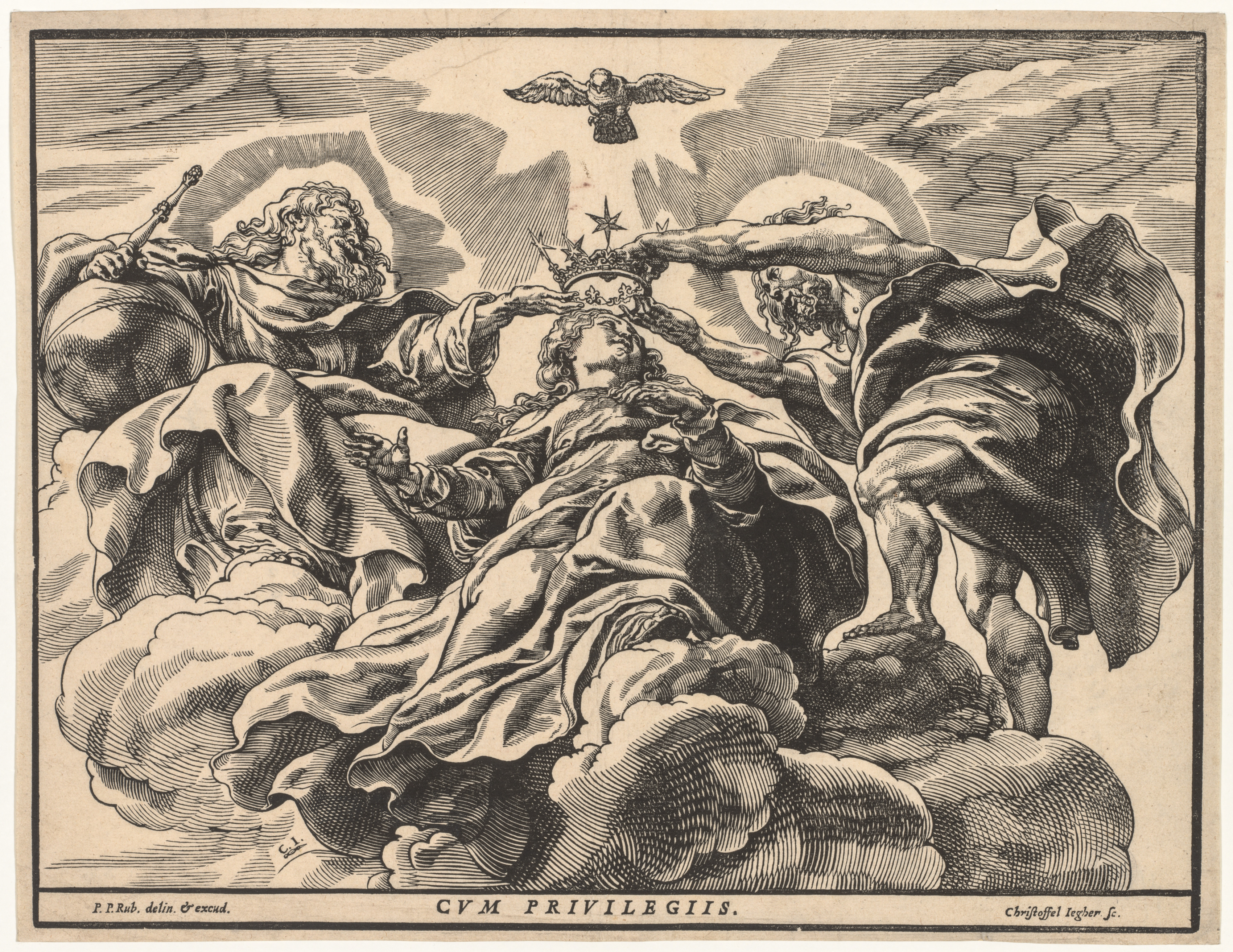 Black and white image of three figures on clouds. The central figure is a woman with long wavy hair wearing a long robe. Two men on either side of her with long hair and beards, wearing long robes. The man on the left holds a scepter and orb. The man on the right places a crown on the woman's head. The man on the left also holds part of the crown. An image of a bird with wings outstretched floats above. The sky behind them has lines indicating clouds. The image has a border and text at the bottom. The text at the bottom reads "CVM PRIVILEGIIS".