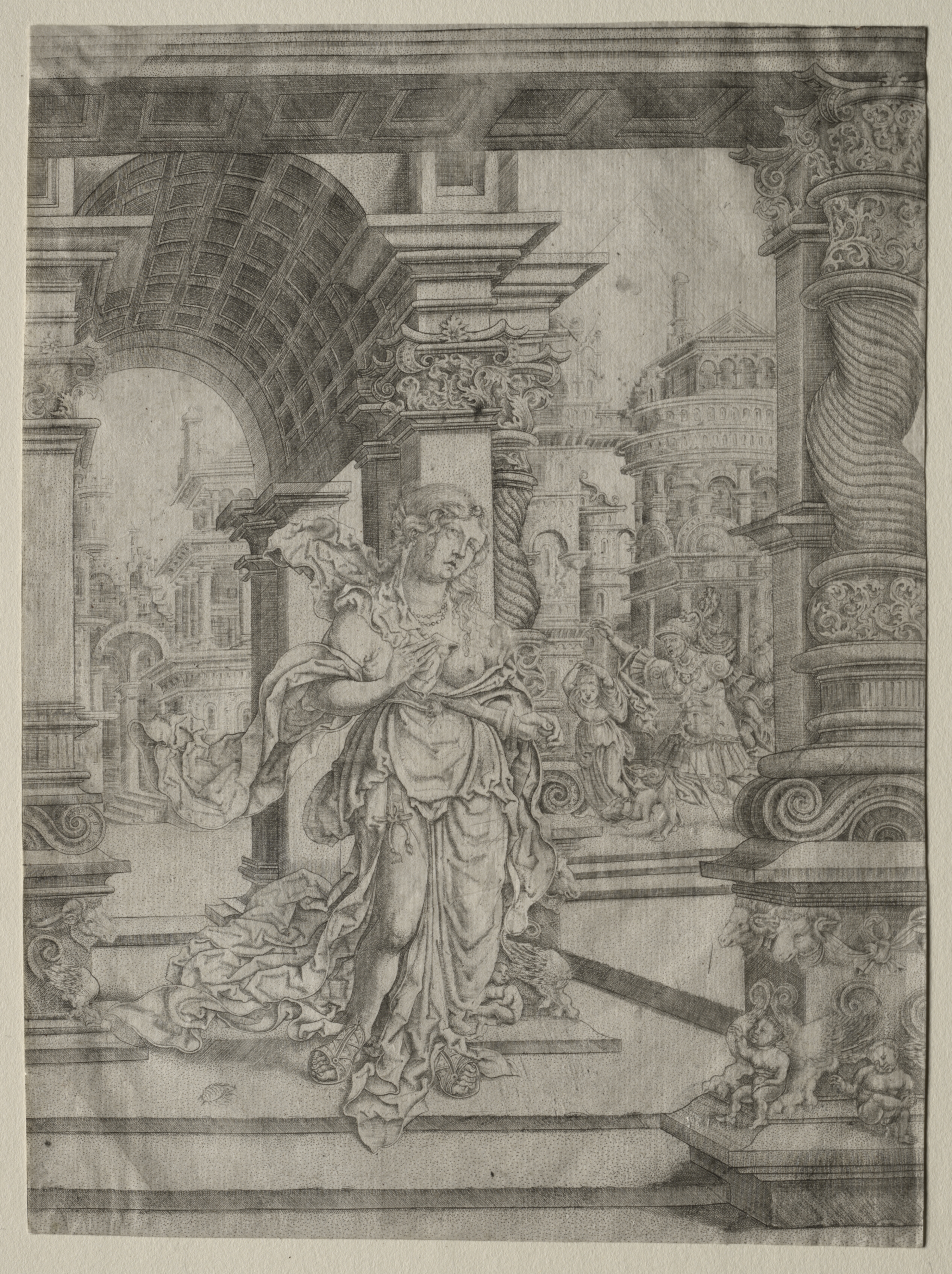 Black and white drawing of a woman standing on steps. The woman has light, curly hair and wears a dress with puffy sleeves. She stands on a step with her left arm across her chest, and her right arm down at her side. The dress flows down around her feet. She stands under an archway with columns on either side. The columns have ornate capitals and bases. There are carvings on the columns and on the archway. In the background, there are more buildings and archways. The sky is light. The drawing is in a rectangular frame.