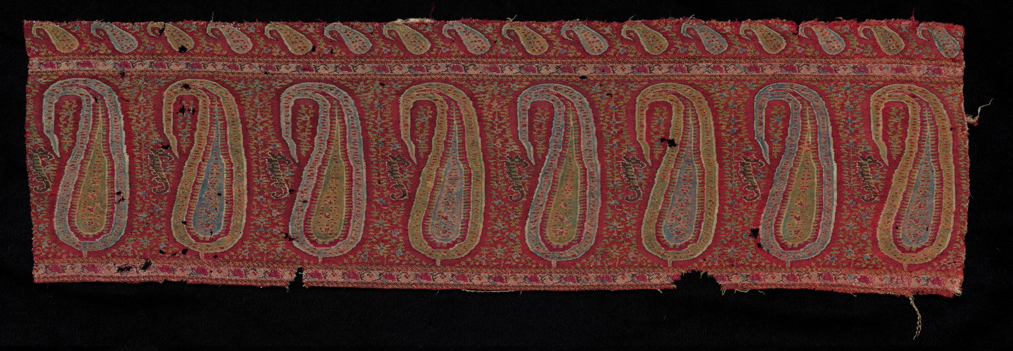 Red rectangular textile with frayed edges and several holes. The textile has paisley pattern in shades of blue, yellow, and pink. Eight large paisley shapes, four on each side of center, pointing down. A border of small paisley shapes along top edge. Small floral pattern on red background throughout. Black background behind textile.