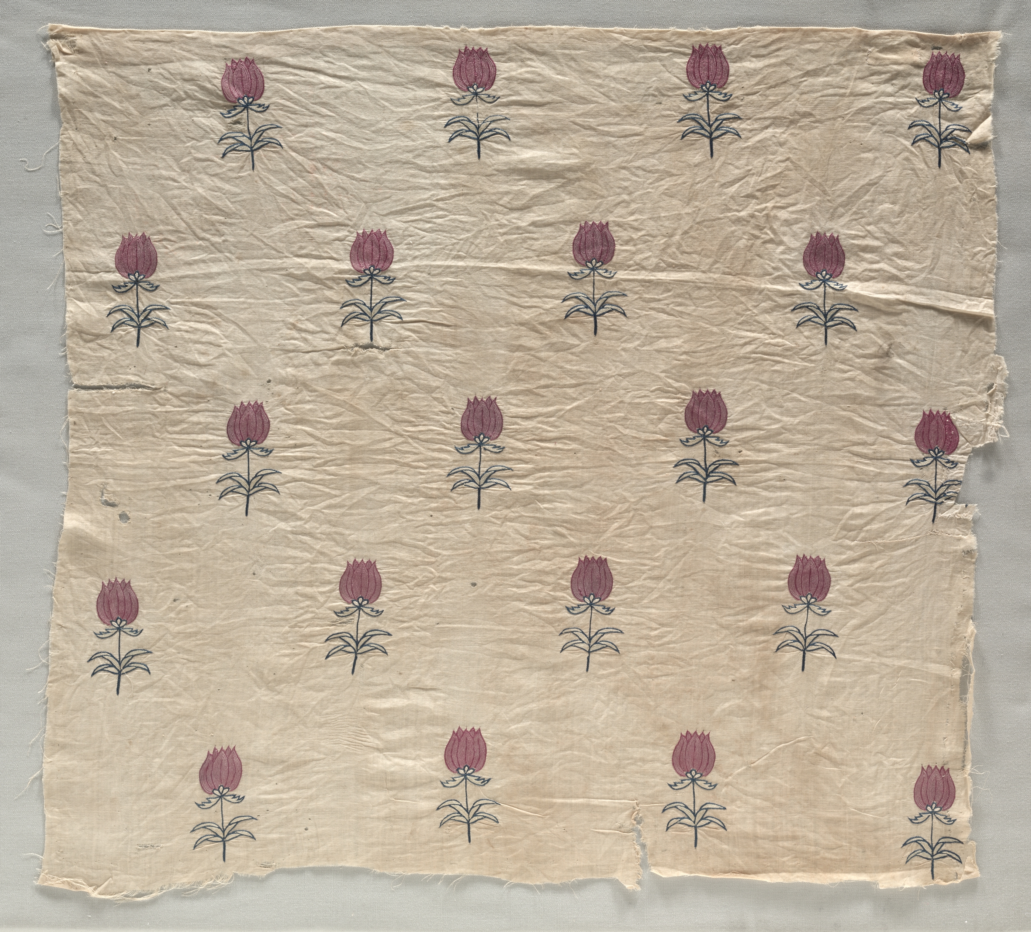 The title of the artwork is "Fragment" by an unknown artist. The image shows a rectangular piece of fabric. The fabric is off-white with a crumpled texture and rough edges. The fabric features a repeating pattern of 16 pink flowers. Each flower has a green stem and leaves. The flowers are arranged in four rows and four columns. The background behind the fabric is light gray.