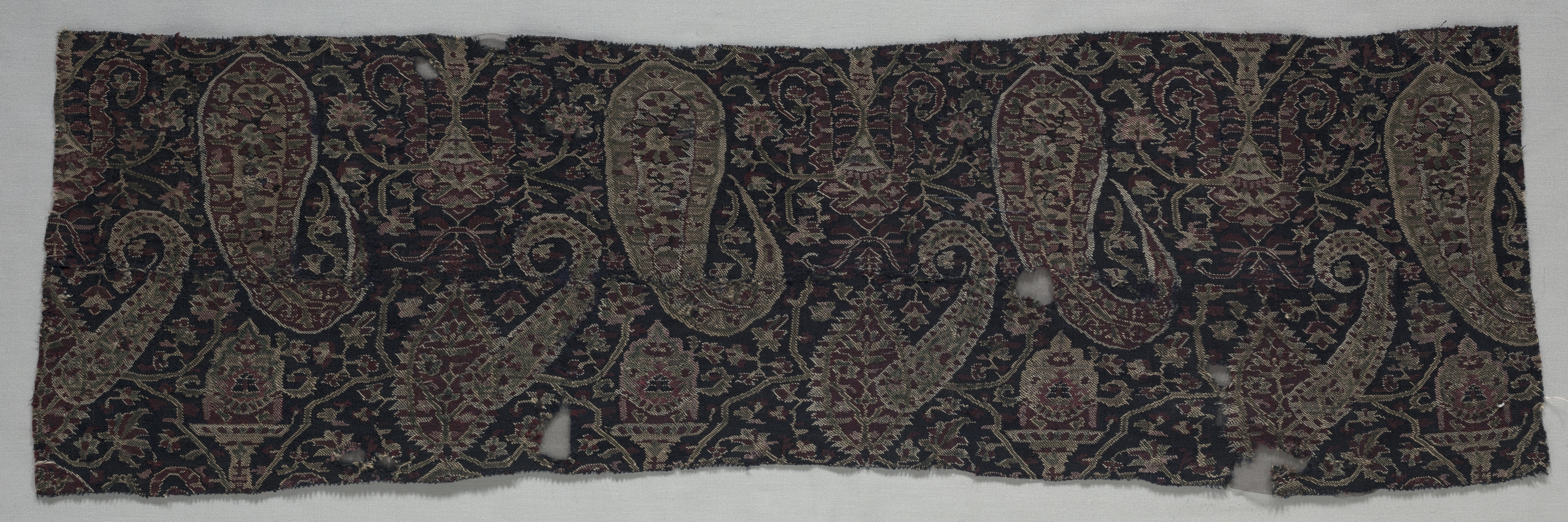 The image is a rectangular piece of fabric with a paisley pattern. The fabric is predominantly black with a repeating design of large paisley motifs in shades of brown, beige, and red. The paisley shapes are teardrop-shaped with curved tails. The fabric has a frayed edge around all sides. There are several small holes and tears in the fabric, particularly along the bottom edge. The background behind the fabric is light gray. The fabric appears to be a fragment of a shawl by an unknown artist, titled "Fragment of a Shawl".
