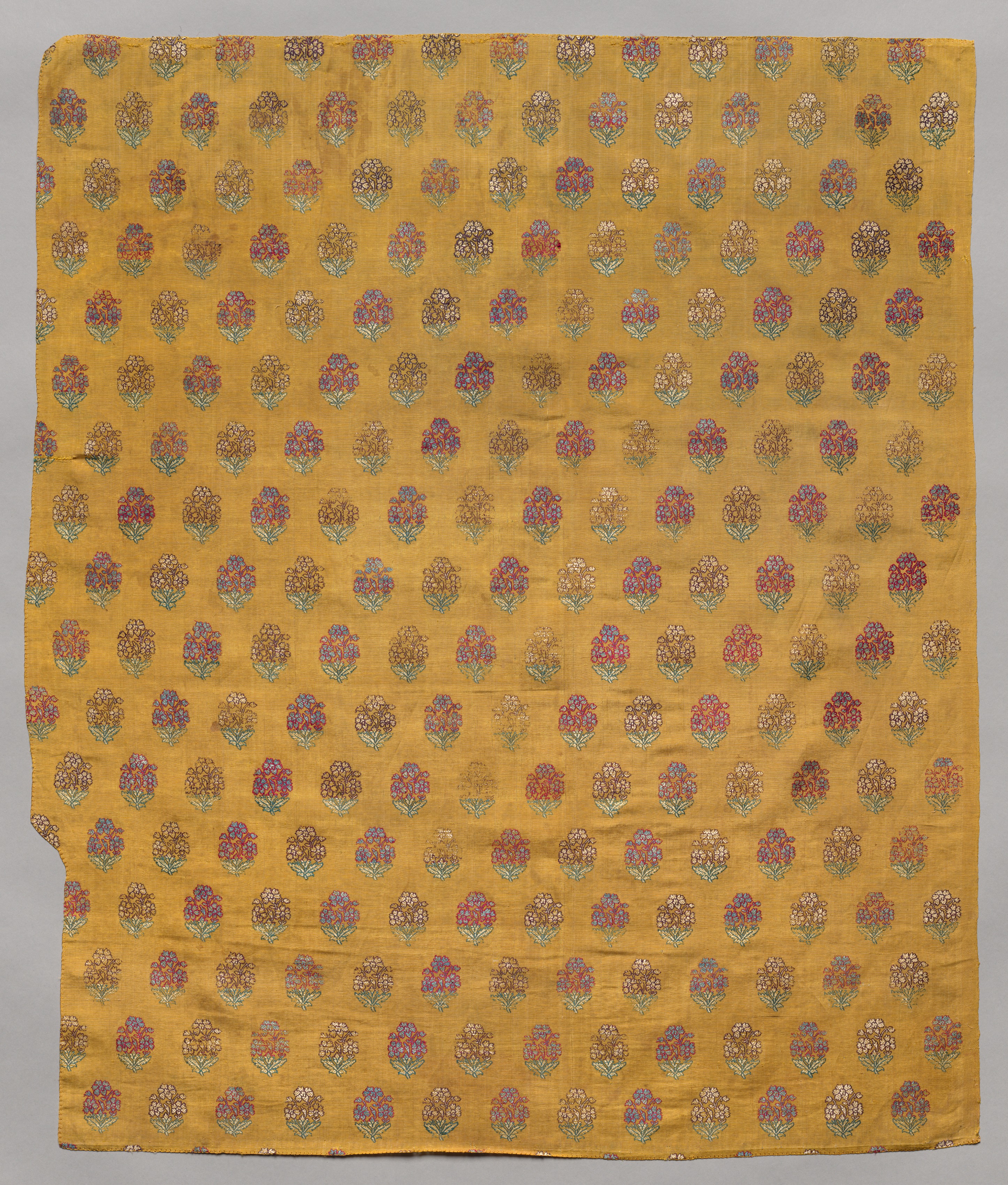 Yellow fabric with a repeating pattern of small flowers. The flowers are various colors including red, orange, purple, blue, and white. They have green stems. The fabric is rectangular and appears to be made of a lightweight material. A corner of the fabric is torn. The background behind the fabric is gray. The title of the image is "Brocade".