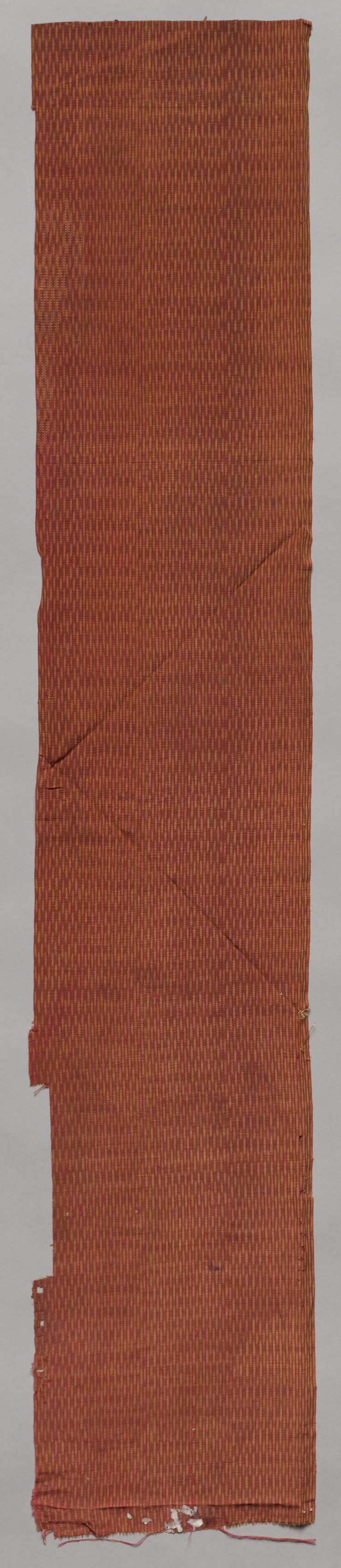 The image shows a long, narrow, vertically oriented piece of fabric titled "Fragment" by an unknown artist. The fabric is reddish-brown and appears to be made of a woven material. It has a rough texture with visible threads. The fabric's edges are rough and uneven, with some fraying at the bottom. There are a few creases and folds in the fabric. The background of the image is light gray.