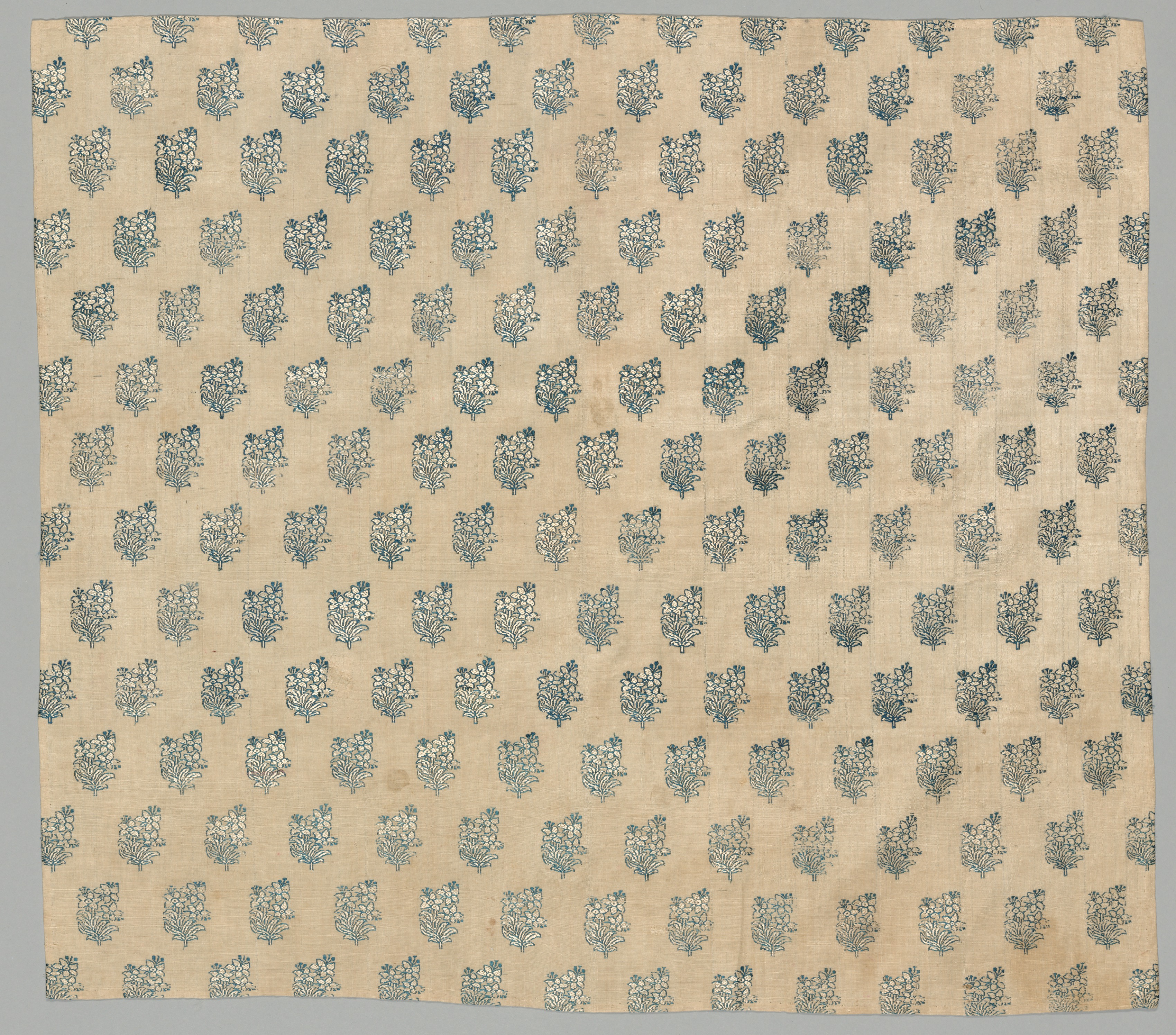 The image titled "Brocade" by an unknown artist depicts a square piece of fabric with a repeating pattern. The fabric is beige with a subtle texture. The fabric features a repeating pattern of blue and white floral designs. The floral designs are arranged in rows and columns, with each design being similar but varying slightly in shade. The designs are roughly teardrop-shaped with a narrow stem at the bottom and a cluster of flowers and leaves at the top. The background behind the fabric is gray. The fabric appears to be slightly wrinkled and has a few small dark spots. The fabric takes up most of the image.