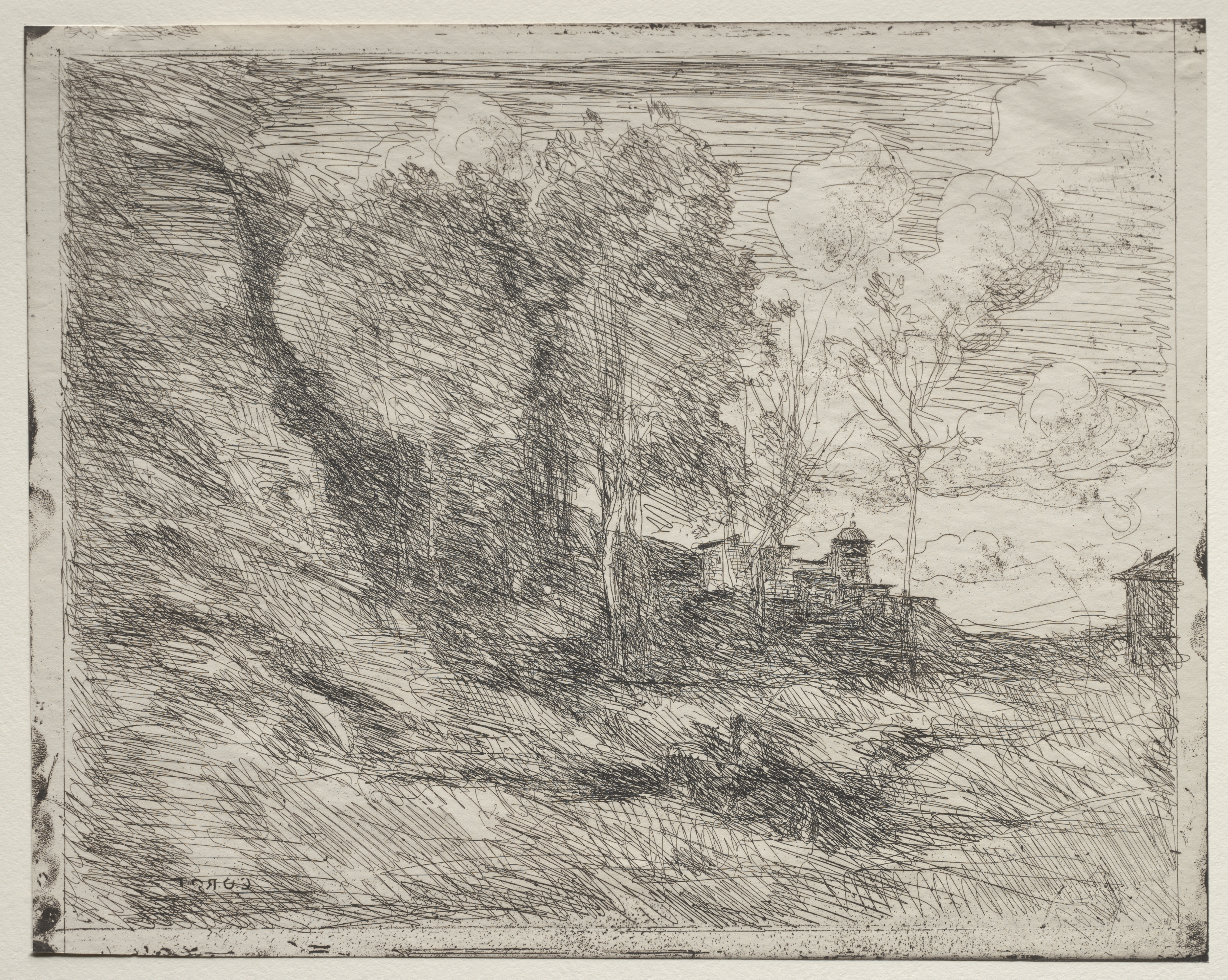 A Souvenir of Ostia by Jean Baptiste Camille Corot: A landscape drawing on a rectangular piece of aged paper with darker edges. The landscape drawing depicts a hillside with a few trees. The trees have thick trunks and bushy tops. The trees are on the left and middle of the drawing. The right and center background shows a low building with a dome on top. The sky has horizontal lines running across it and scattered clouds. The entire drawing is made up of intersecting black lines on a light background. The lines vary in density, creating different shades of gray. The image border has thin, uneven white edges around it.