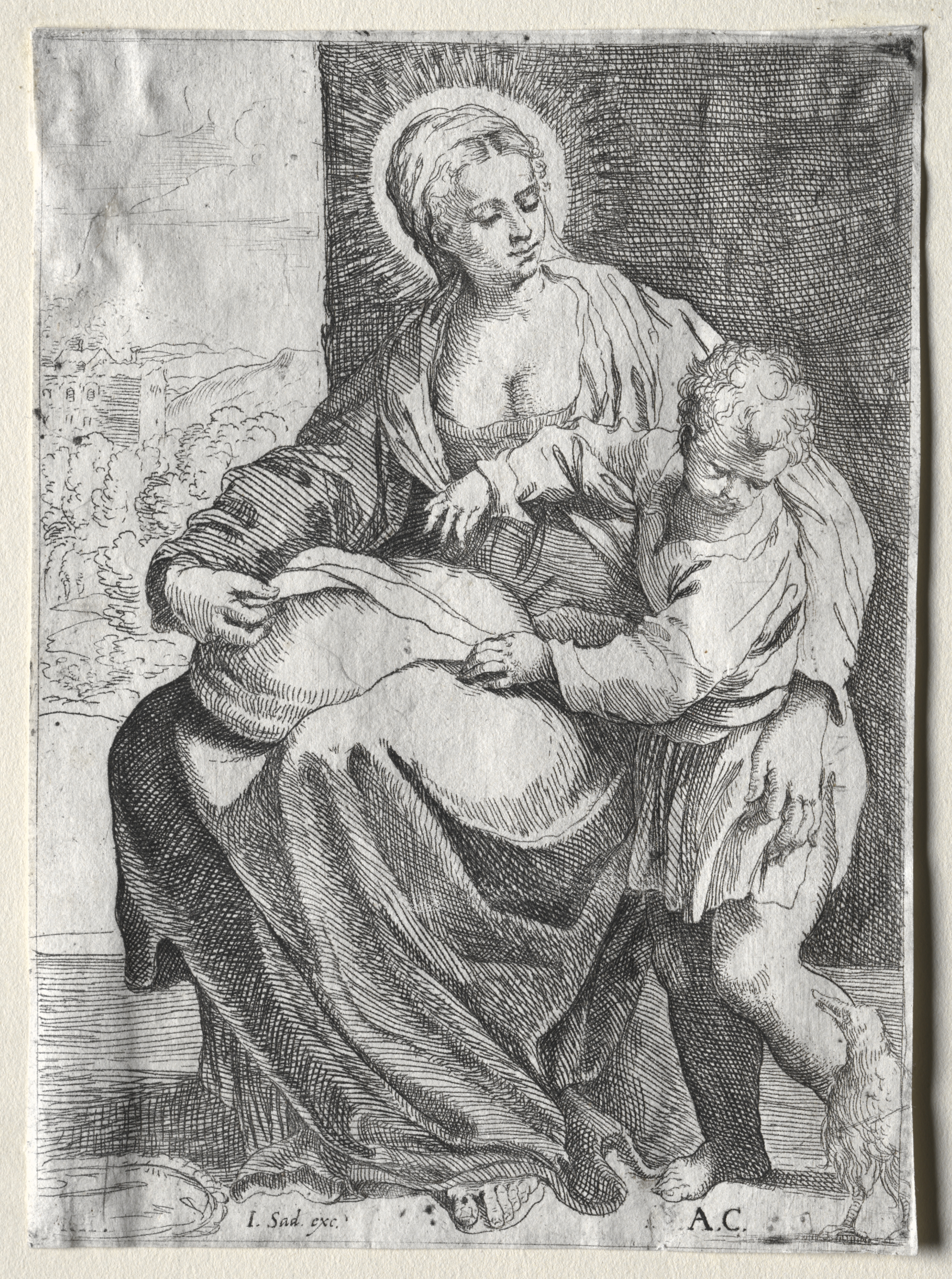 Black and white image of a seated woman with a halo around her head and a baby on her lap. The woman is wearing a long dress and a shawl. She is looking down at the baby. The baby is wearing a cloth and there is a raven on the right. The background on the left side shows a landscape with trees and a building. The right side behind the figures is dark. There are signatures at the bottom.