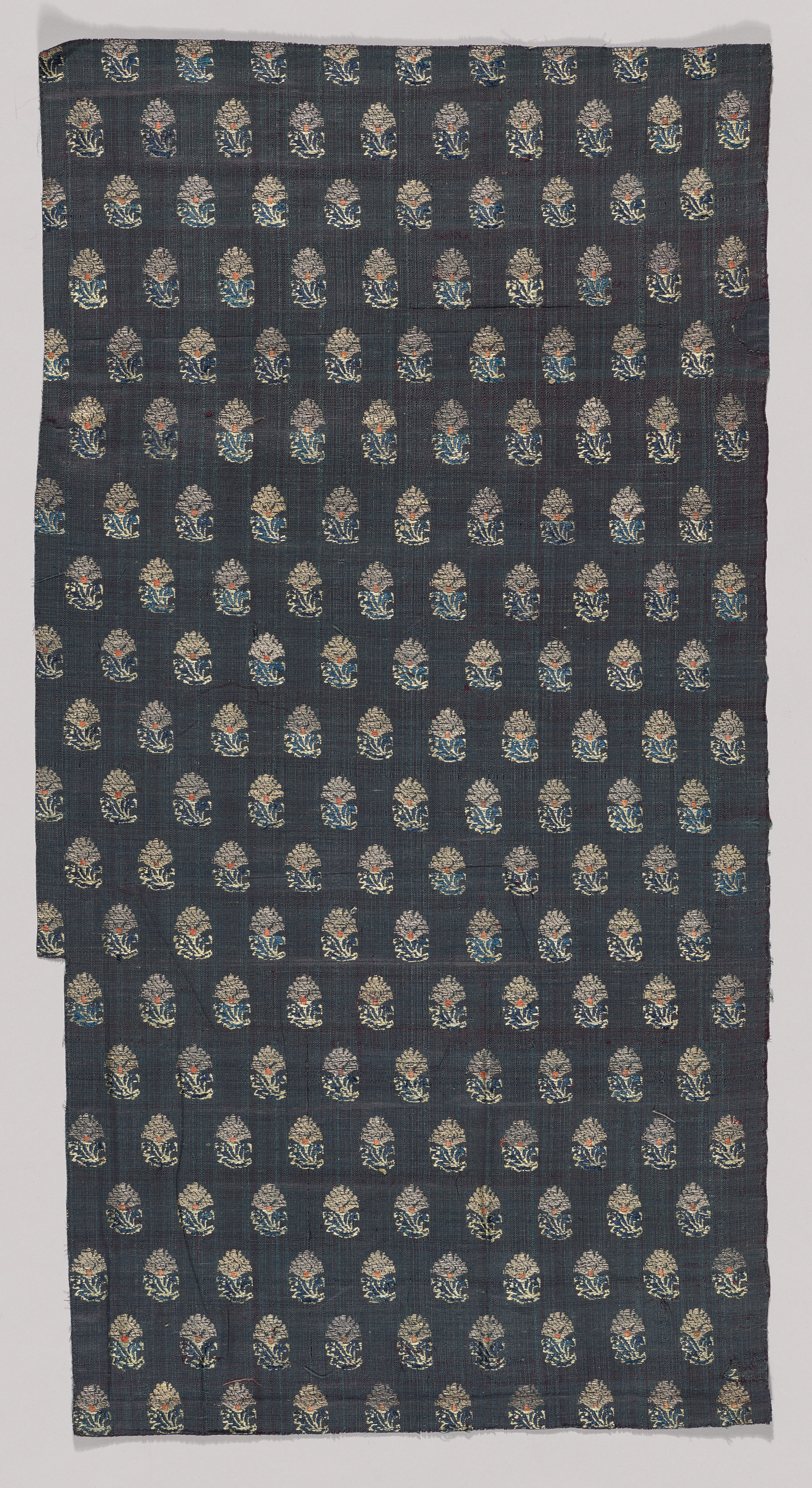 Dark gray fabric with repeating floral pattern. The fabric is rectangular and has a grid-like texture. The floral patterns are small and consist of a cluster of leaves and petals in shades of blue, orange, and beige. The background of the fabric is a dark gray color. The fabric appears to be made of a thin material, possibly silk or cotton, and has a smooth texture. The edges of the fabric are rough and uneven, suggesting that it may have been cut or torn. The overall design of the fabric is intricate and ornate, with a repeating pattern of flowers and leaves that creates a sense of rhythm and texture. Fragment by artist.