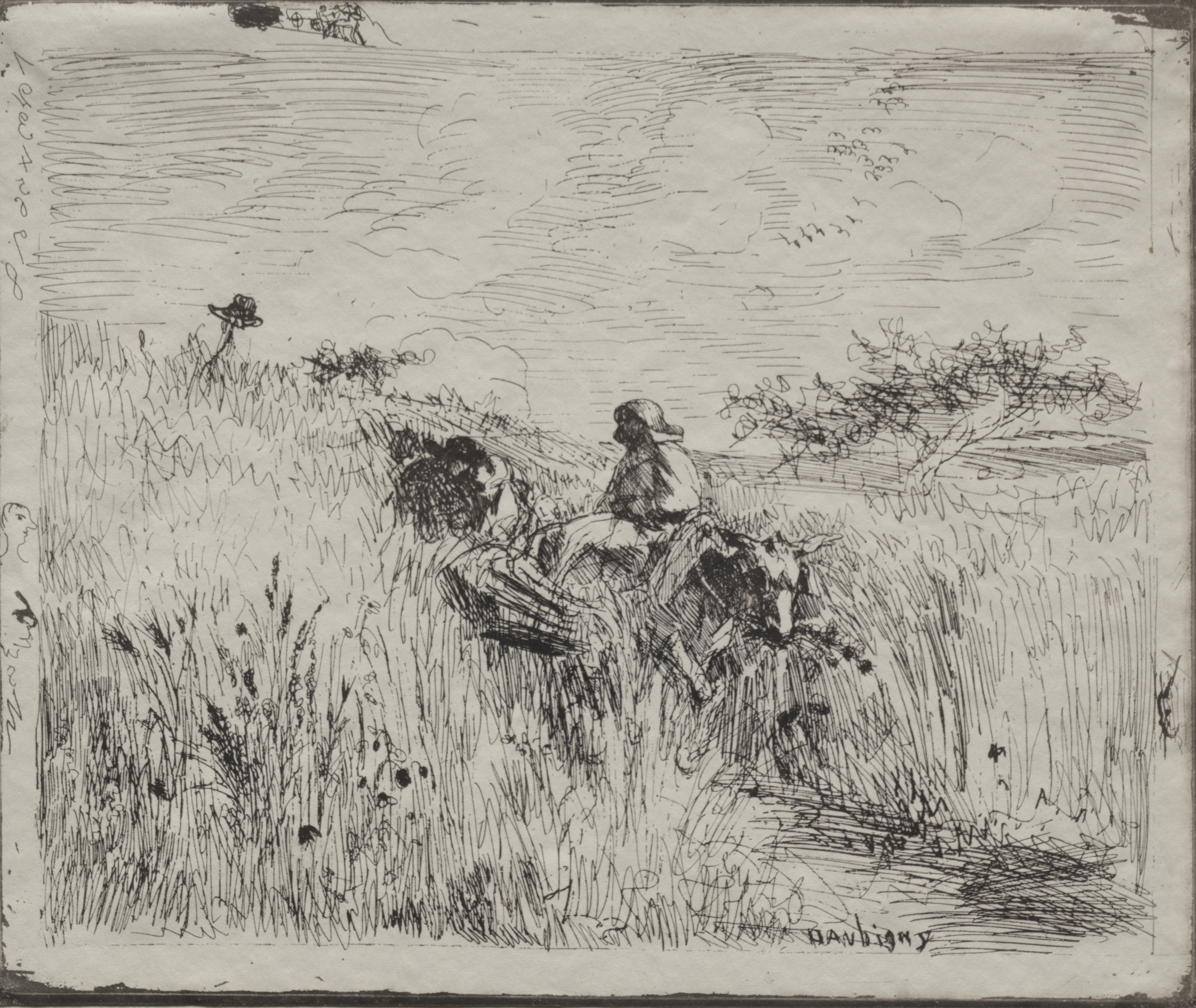 Black and white sketch of a person sitting on a path through a field of tall grass. The person is wearing a hat and a long-sleeved shirt. They are sitting on the path, which is made of dirt and has tall grass on either side. There are some bushes and trees in the background. The sky is cloudy. The artist's name is written in the bottom-right corner. The overall scene depicts a serene and peaceful rural landscape.