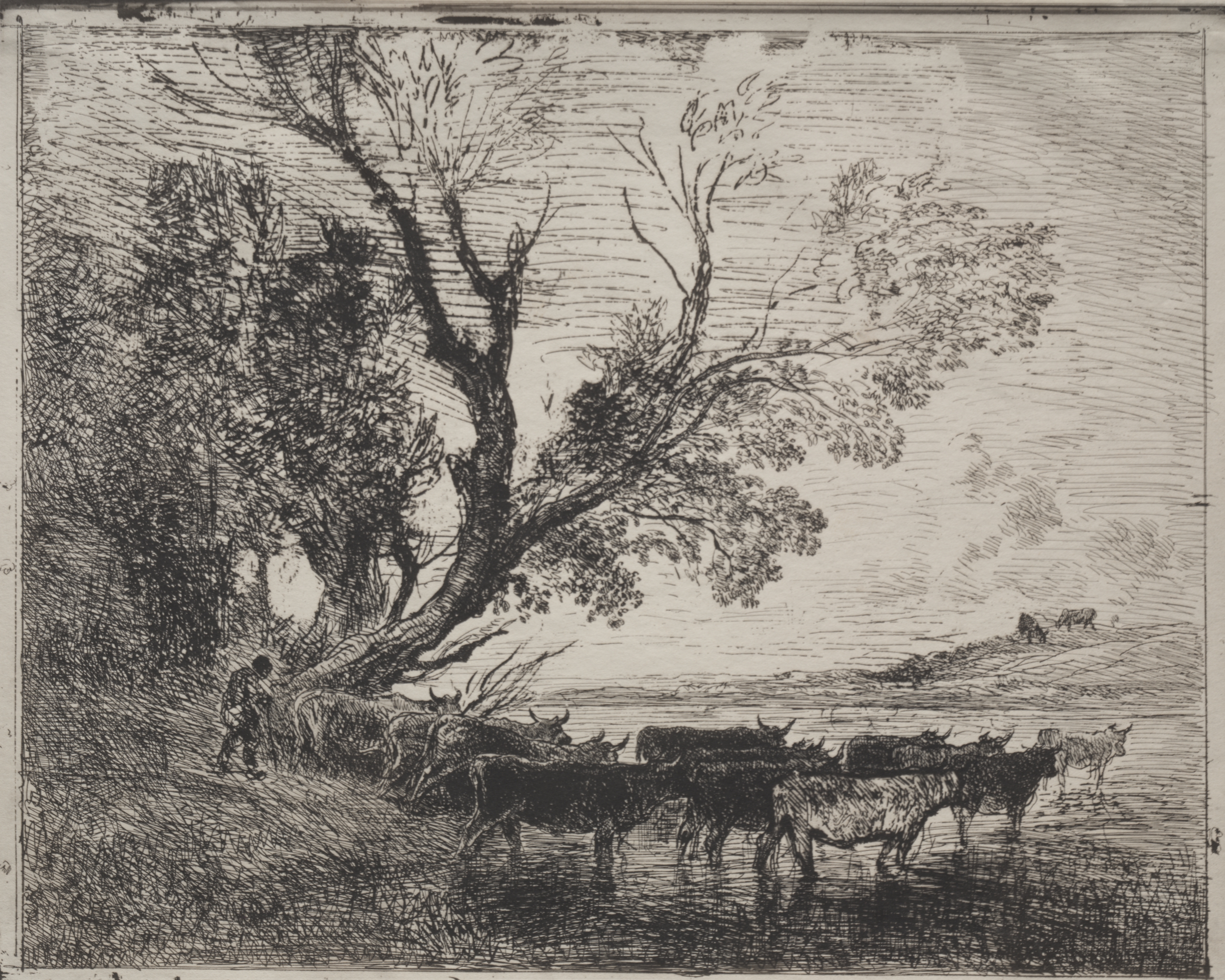 The Ford by Charles François Daubigny. A black and white sketch of a landscape with a herd of cattle. The cattle are standing in a body of water that extends to the horizon. The cattle are dark in color, with some lighter patches, and have their heads down. A man stands on the left side of the image, next to a large tree with a twisted trunk and branches. The tree has some leaves, but many of its branches are bare. More trees and bushes are on the left side of the image. The background shows a field with more cattle grazing. The sky above has some clouds. The image has a thin border around it.