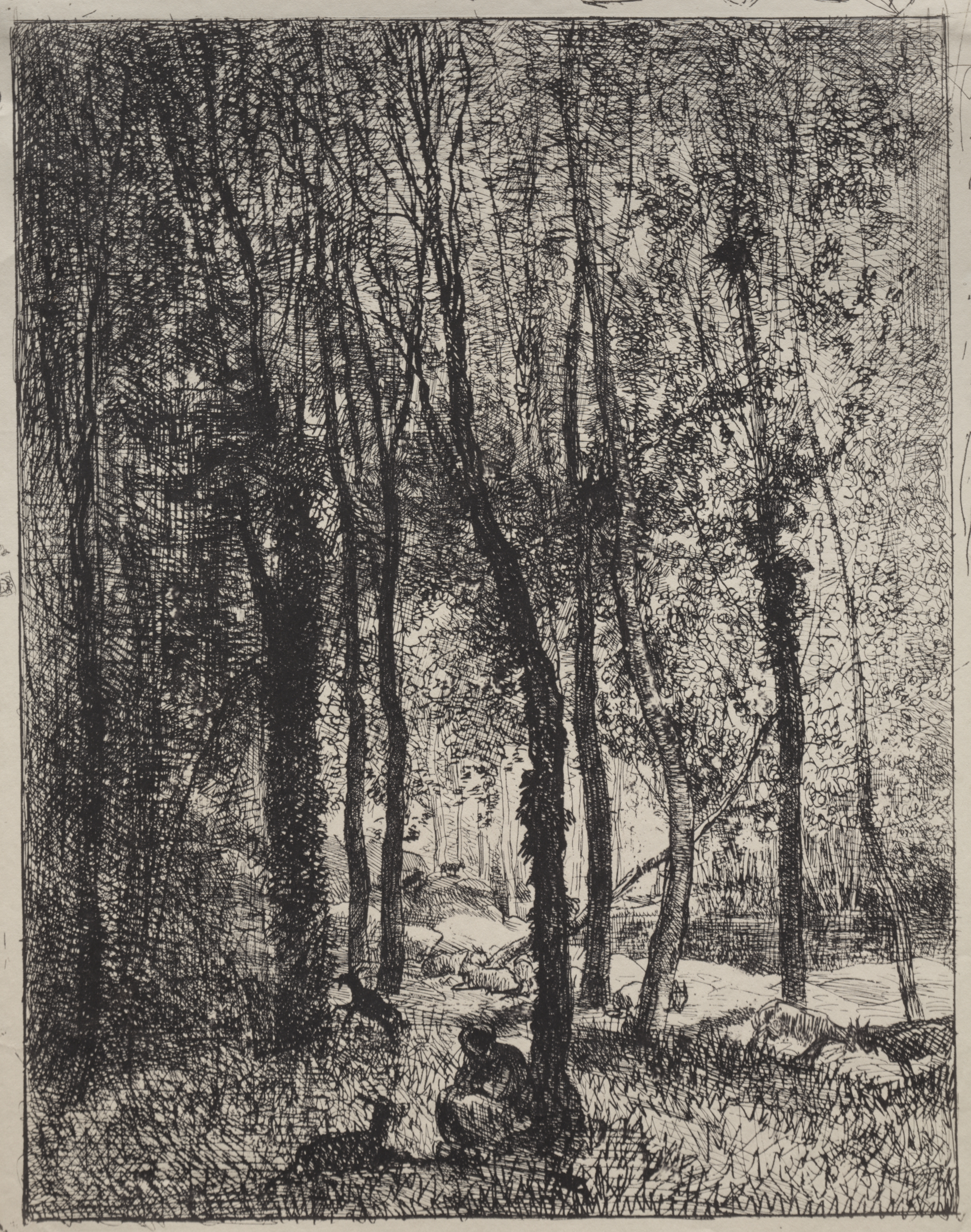 The Goatherd Girl by Charles François Daubigny: Black and white drawing of a forest scene with trees, grass, and a small stream or river. Several goats are present. The trees are densely packed, with some bare branches and others with leaves. The forest floor has tall grasses and underbrush. A body of water is in the background, behind the trees. A girl is sitting on a rock, tending to the goats. The style is highly detailed with many lines and textures. The image is rectangular with a thin border around the edges.