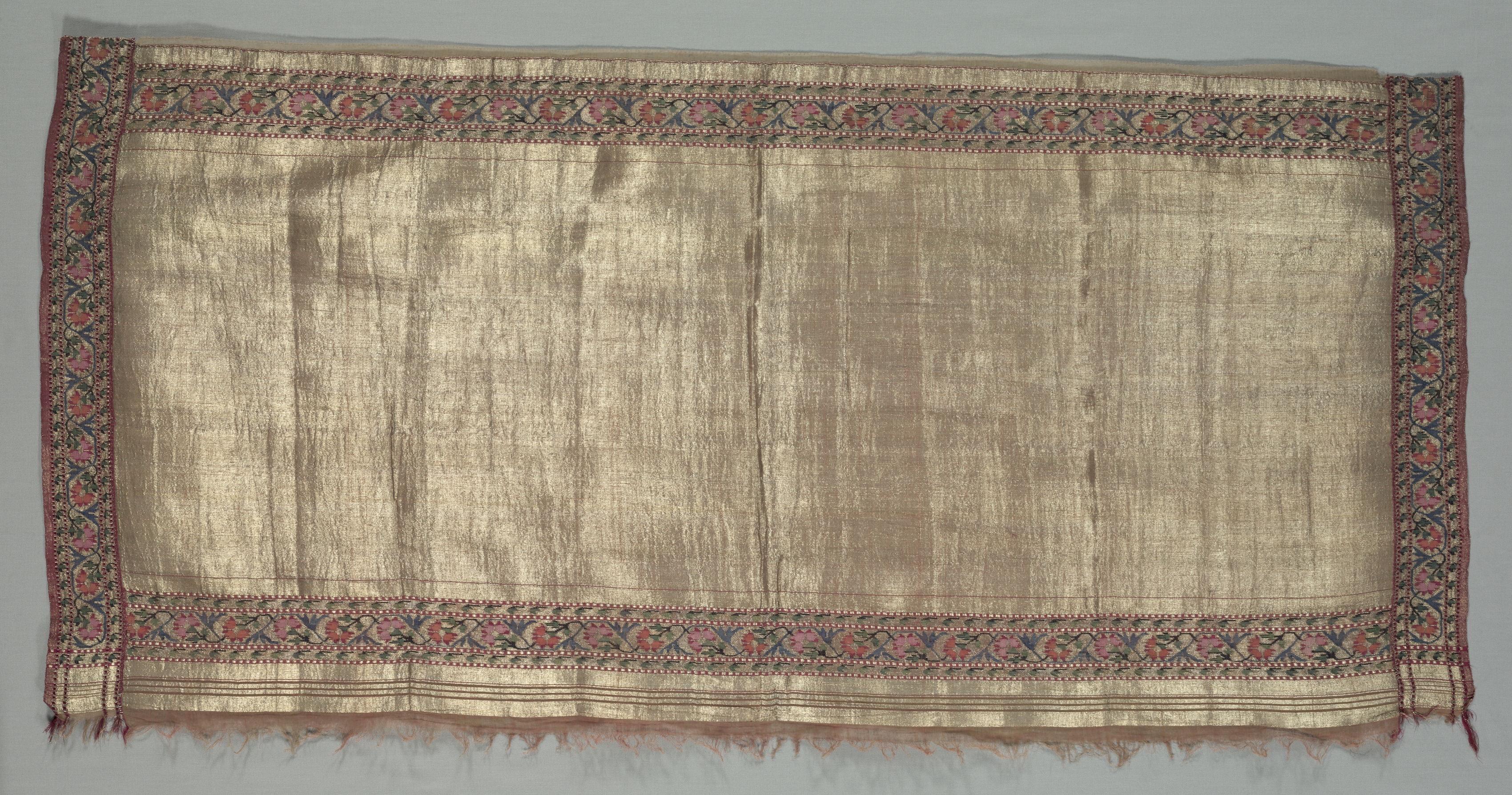 Gold-colored fabric with intricate borders. The fabric rectangular in shape with frayed edges on the bottom. Two horizontal decorative borders running across the top and bottom edges. The borders feature a pattern of pink flowers with green stems and blue accents on a red background. A thin gold border on the inside of the decorative borders. The main body of the fabric is a solid gold color with a slightly shiny appearance. The fabric appears to be a Part of a sari by an unknown artist.