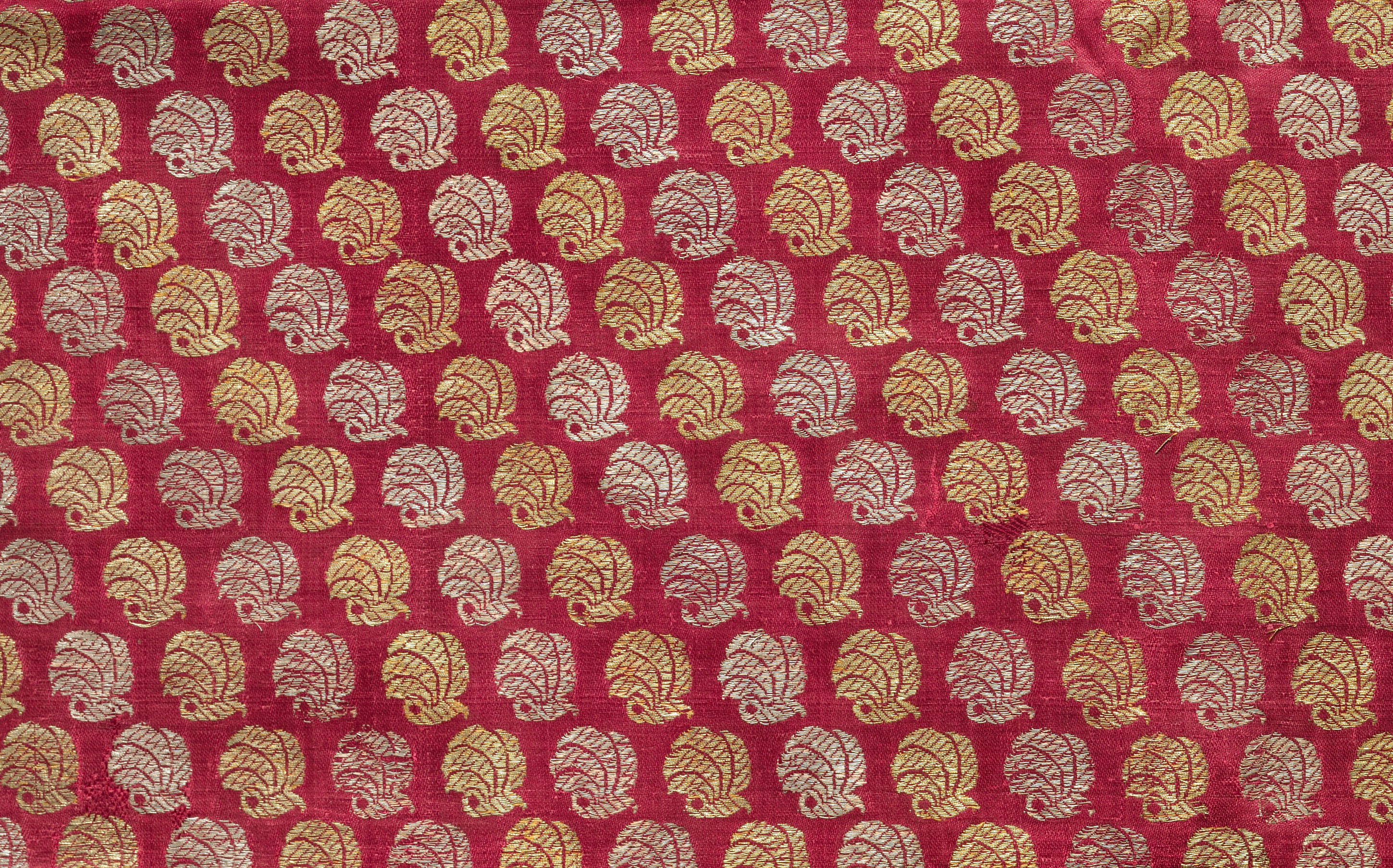 Red fabric with repeating pattern of gold and silver leaves. The leaves have a teardrop shape with a curled end and red veins. The leaves are arranged in rows, with each row containing approximately 13 leaves. The background of the fabric is a solid red color. The title of the work is "Fragment" by an unknown artist.