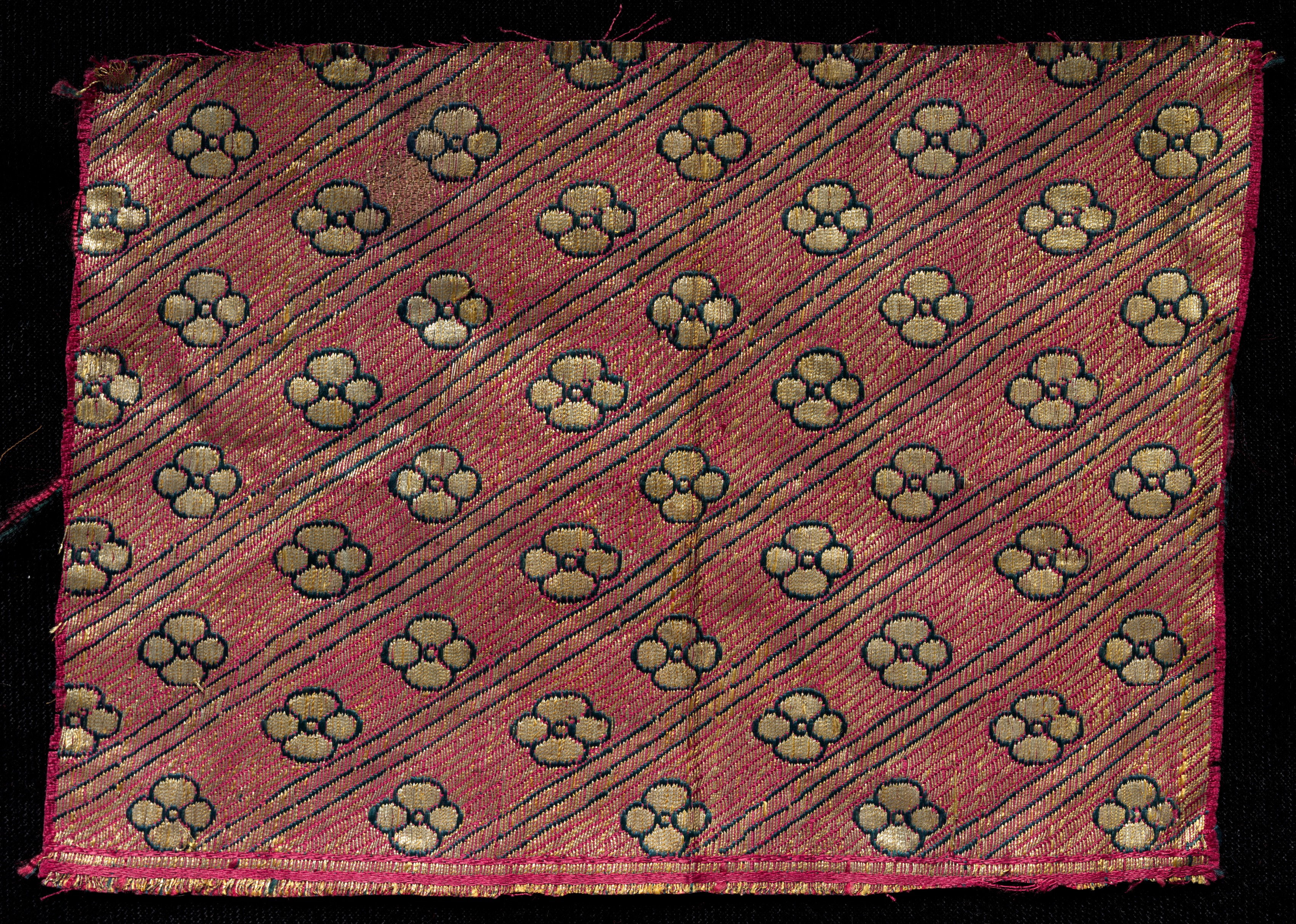 Red fabric with diagonal stripes and gold flowers. The fabric is square-shaped. The background of the fabric is red with thin, diagonal, gold and black stripes. The stripes run from the bottom left to the top right. There are gold flowers with four petals and a black outline. The flowers have a gold center. The edges of the fabric are frayed. The background behind the fabric is black.