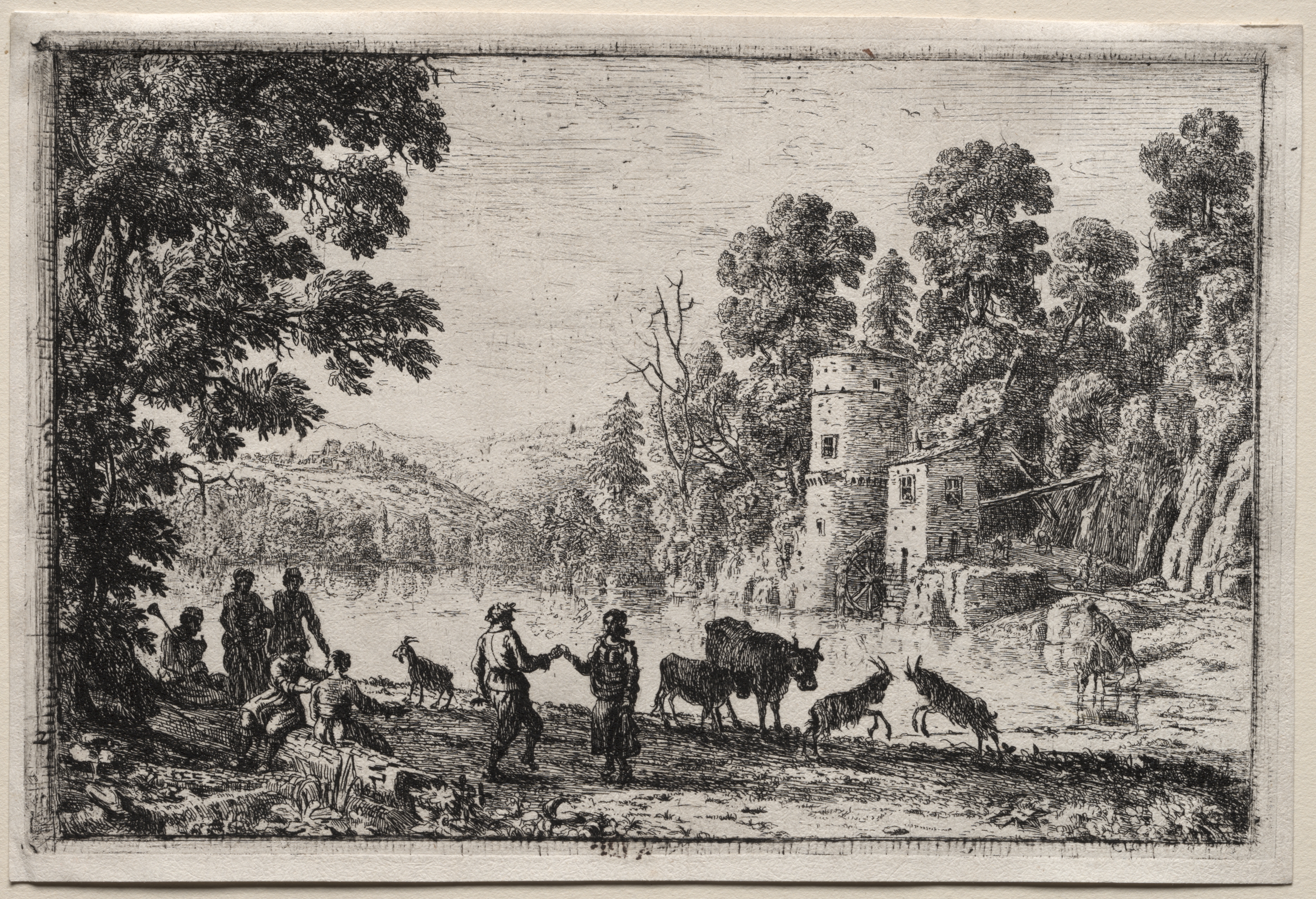 The Dance by the River, created by Claude Lorrain, depicts a riverside scene. A group of people are gathered near a river, with some standing and others seated. A few animals are present, including goats and bulls. A large tree stands on the left side, while a building with a tower and a water wheel is on the right. The background features trees, hills, and a clear sky. The entire scene is rendered in black and white.