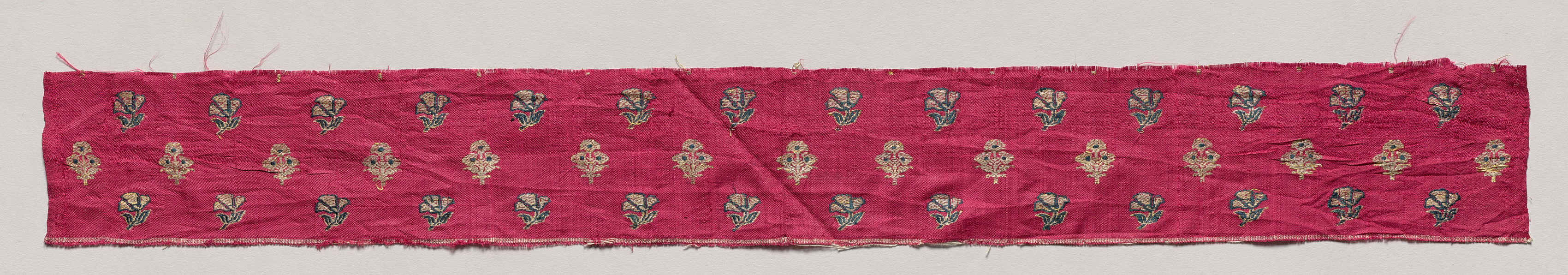 The image shows a long and narrow strip of pink fabric with intricate designs. The fabric is rectangular and oriented horizontally. The fabric has a frayed edge on the top and bottom. The fabric is pink with 36 small, symmetrical designs evenly spaced in six rows of six. The designs are symmetrical and have a central gold element surrounded by blue, green and pink details. The background of the image is a plain off-white color. The fabric by Gulgee is titled "Narrow Strip".