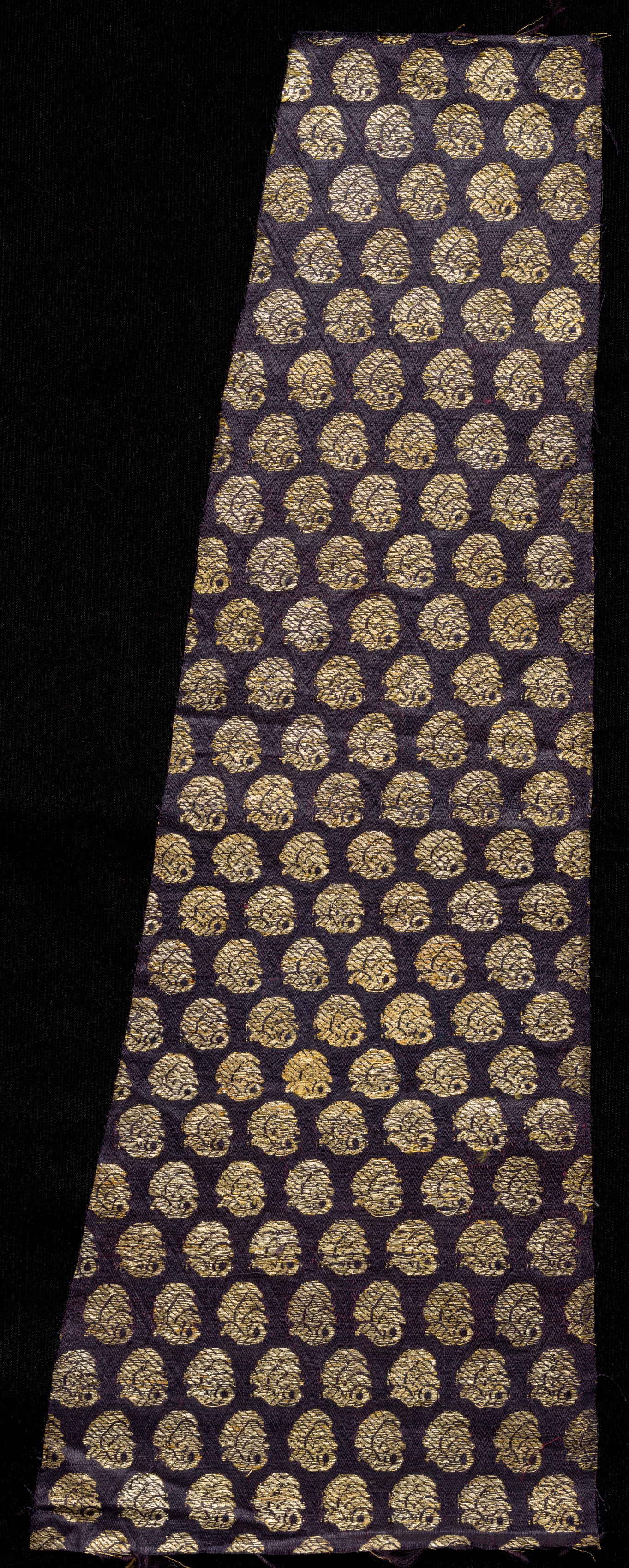 Navy blue tie with gold paisley patterns. The tie is long and rectangular. The background is solid black and there is a white border at the top and bottom. The artist is unknown but the title is "Fragment".