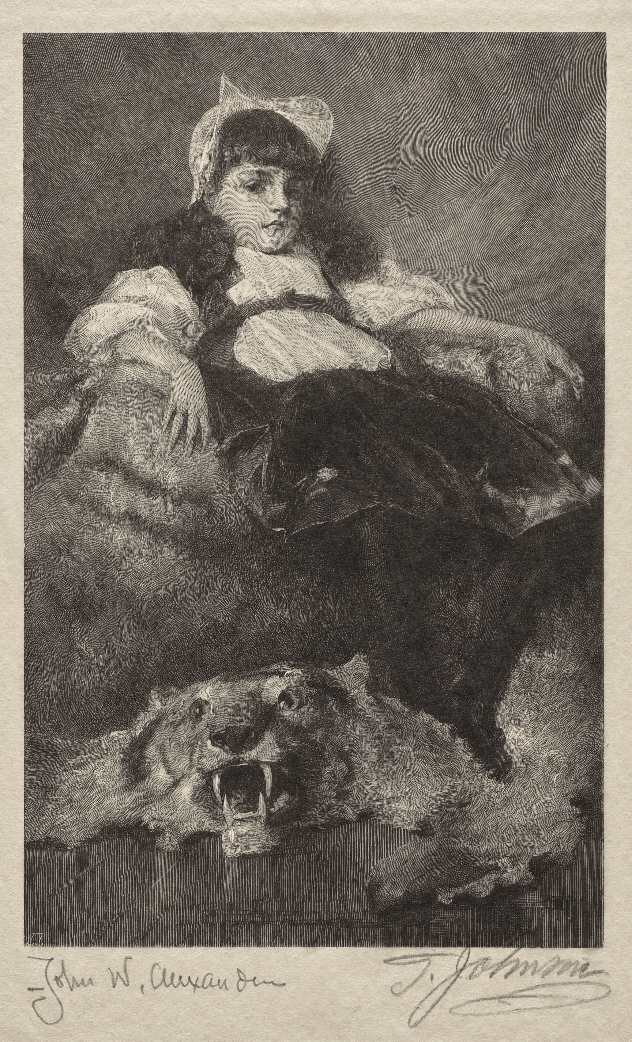 Black and white portrait of a child, a young girl with dark curly hair wearing a white bonnet, a white blouse with puffy sleeves and a dark dress. The girl sits on a large animal pelt with the head at the bottom of the image; the mouth of the animal is open showing its fangs. The background is shades of gray. The work is by Thomas George Johnson.