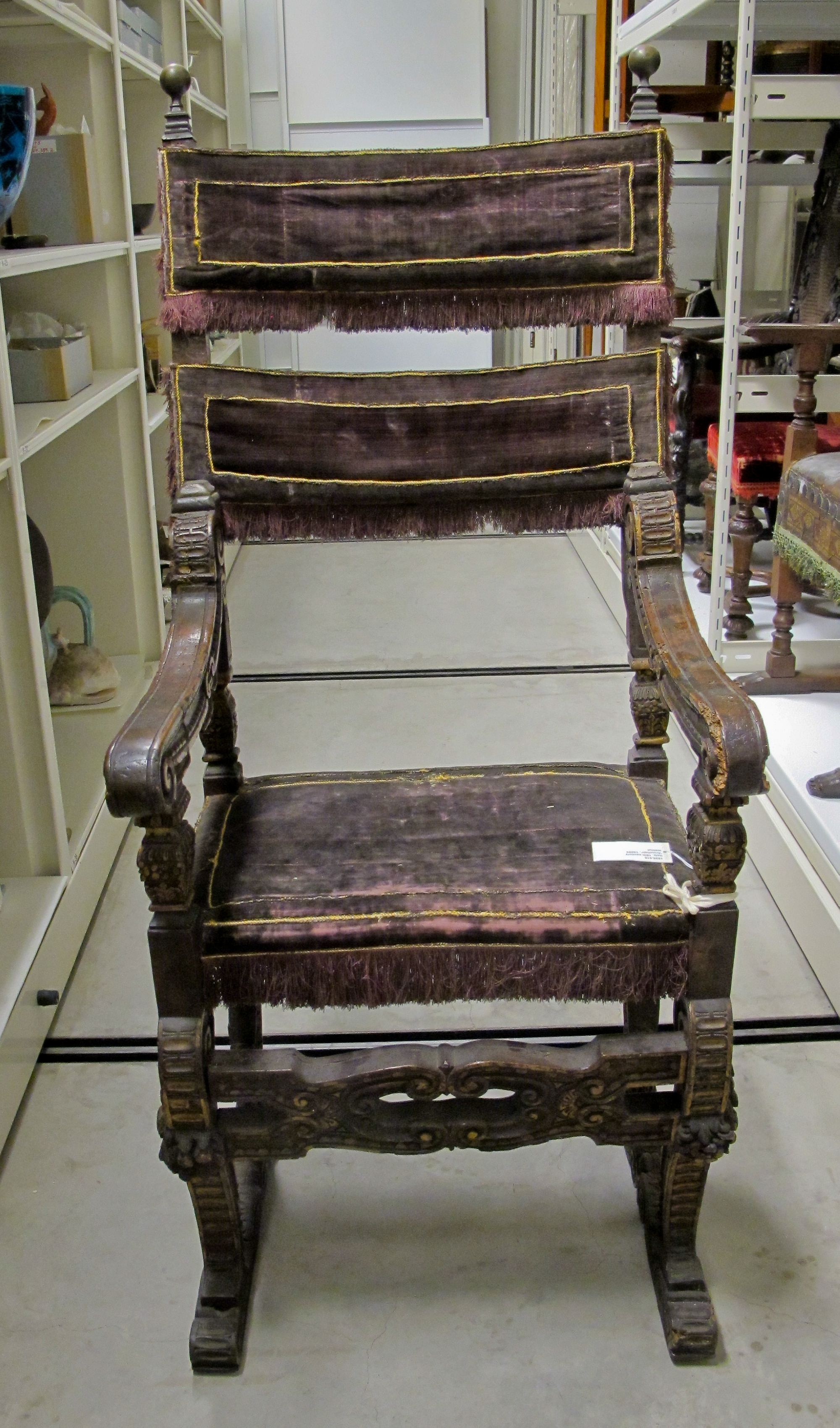 Dark brown wooden armchair with a high back. The chair has a dark brown upholstery with pinkish undertones and yellow stitching. There are three rectangular sections of upholstery on the backrest. The chair has armrests and a seat with fringe along the bottom edges. The wooden frame features ornate carvings. The chair appears to be in a room with white shelving units and a concrete floor. Other furniture pieces are visible in the background. "Armchair" by artist.