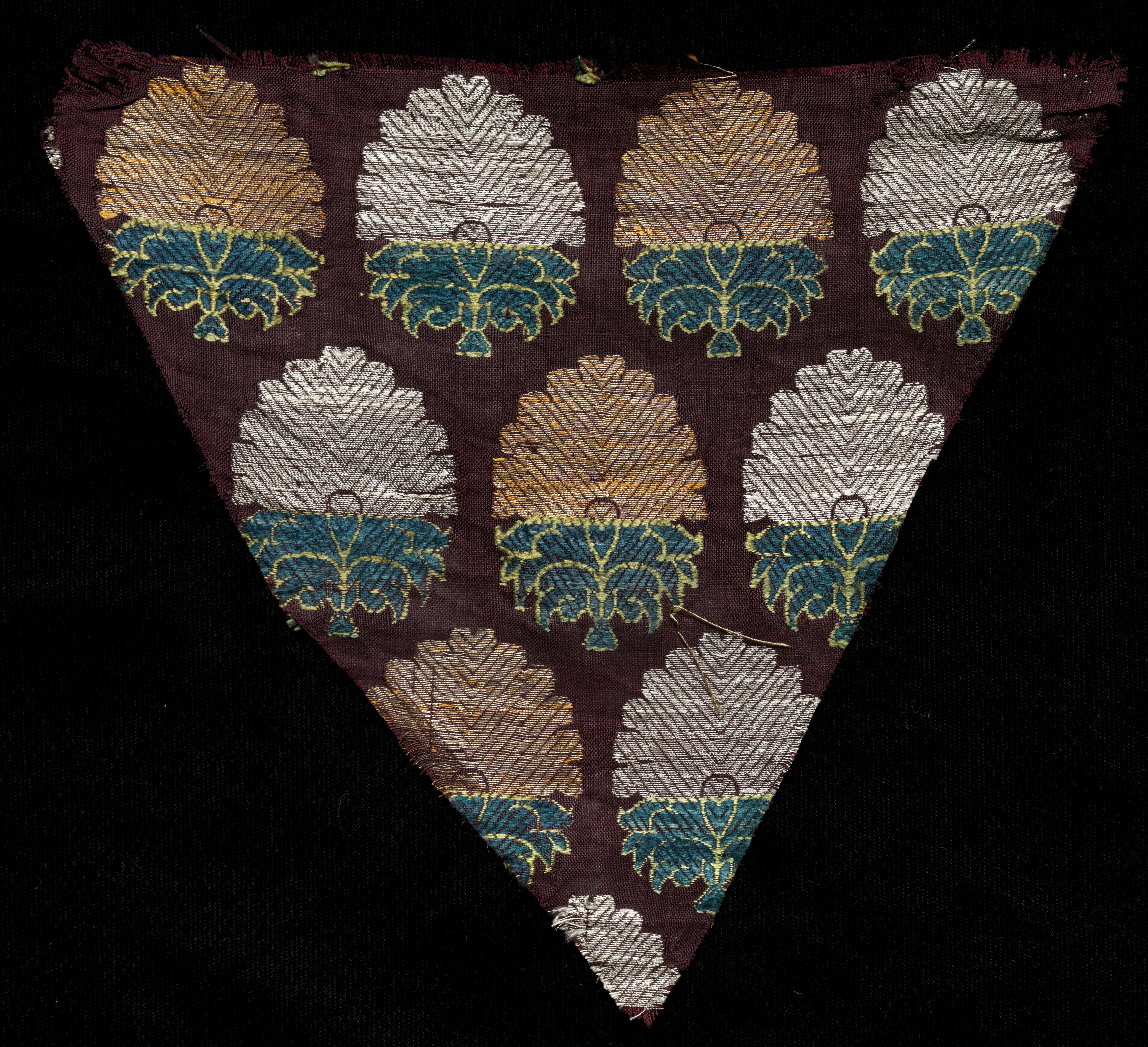 Dark brown triangular fabric with frayed edges, featuring a repeating pattern of stylized flowers or leaves in white, gold, and blue-green hues with yellow outlines. The fabric showcases a symmetrical arrangement of the design elements, with the pointed end facing downwards. The background of the image is black. Title: Fragment Artist: Unspecified.