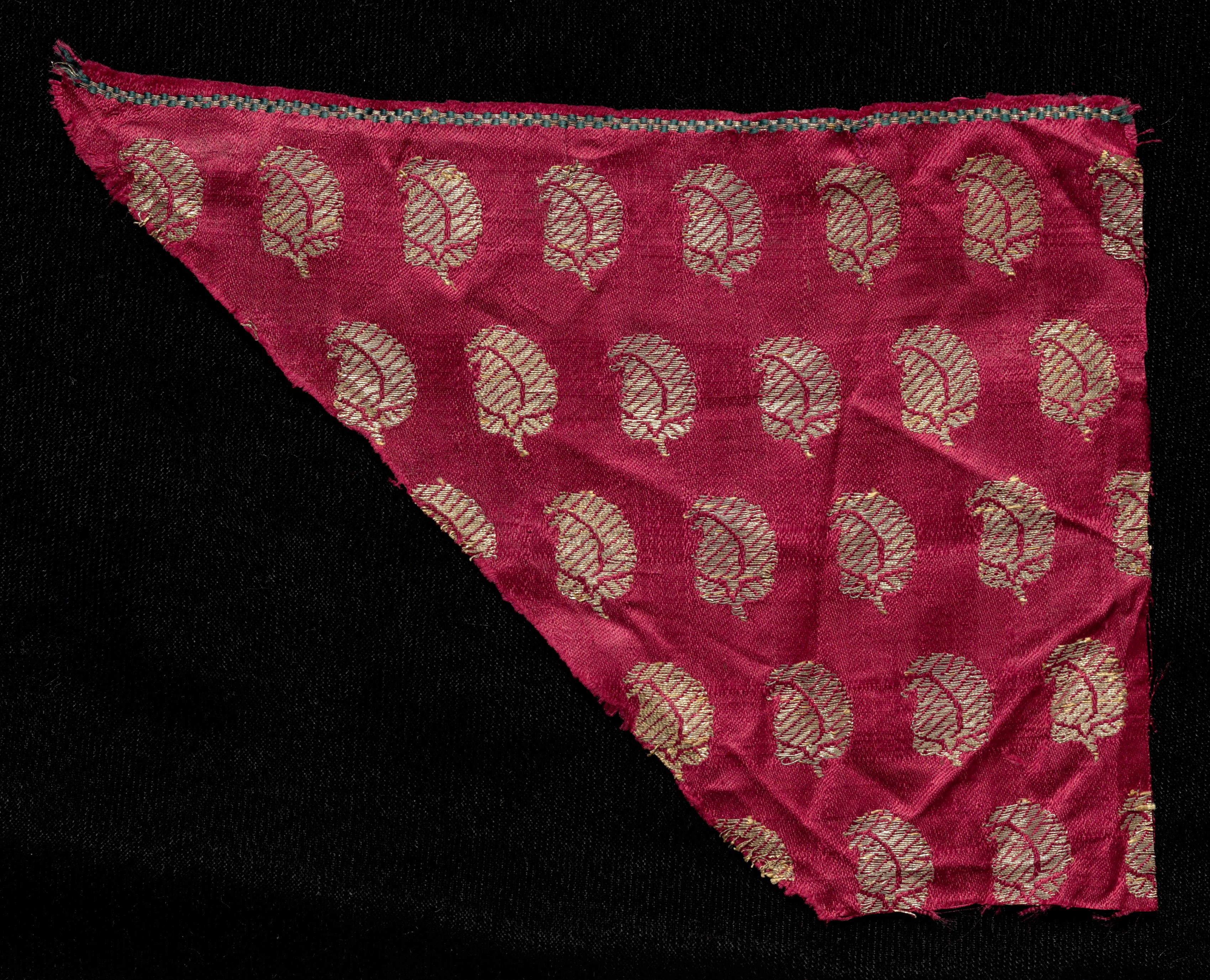 Red fabric with gold leaf designs and a blue and green stitched edge, cut into a triangular shape with the right angle pointing down; fabric appears crumpled; against a black background. Fragment by artist not specified.