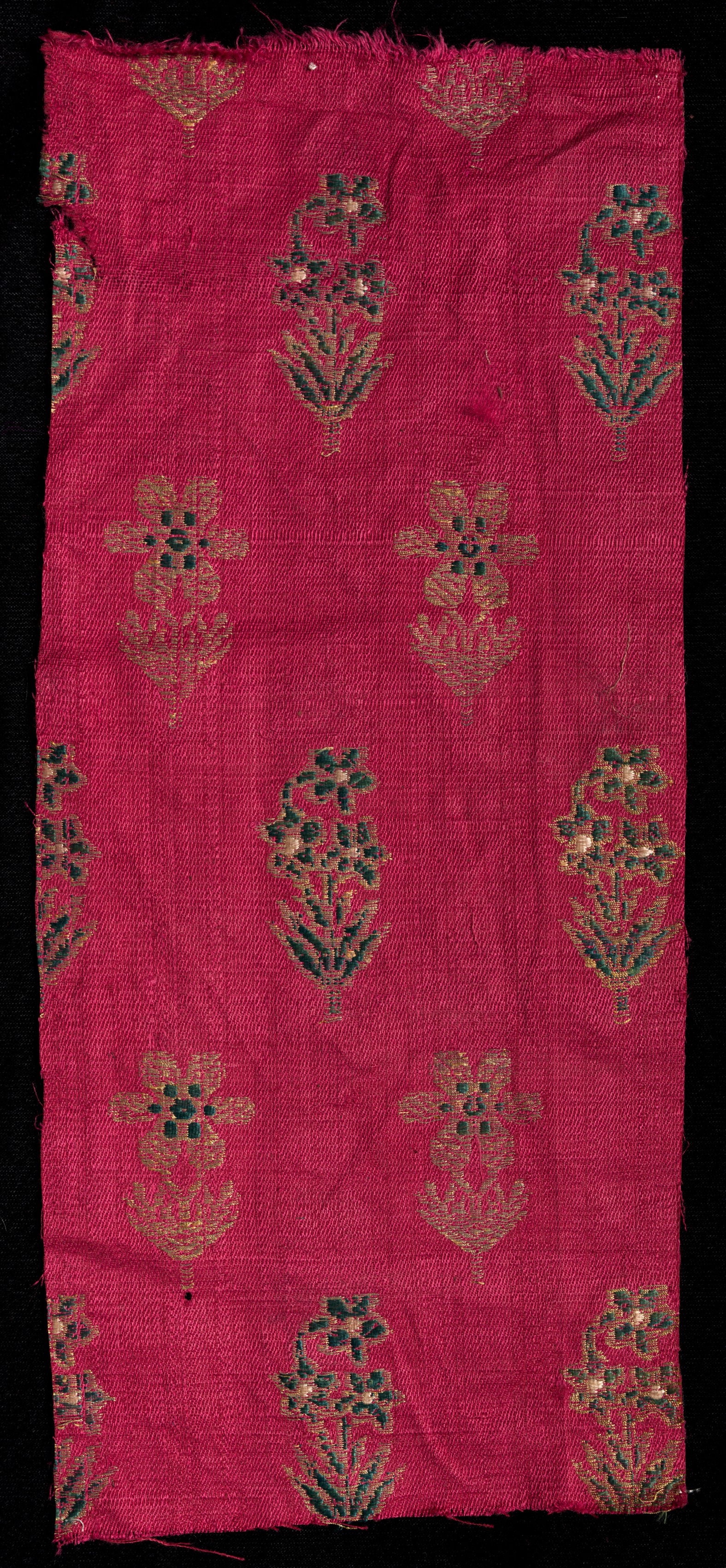 Red fabric with frayed edges, featuring a repeating pattern of 13 floral motifs in gold, green, and pink hues. The fabric is set against a black background. "Fragment" by the artist.