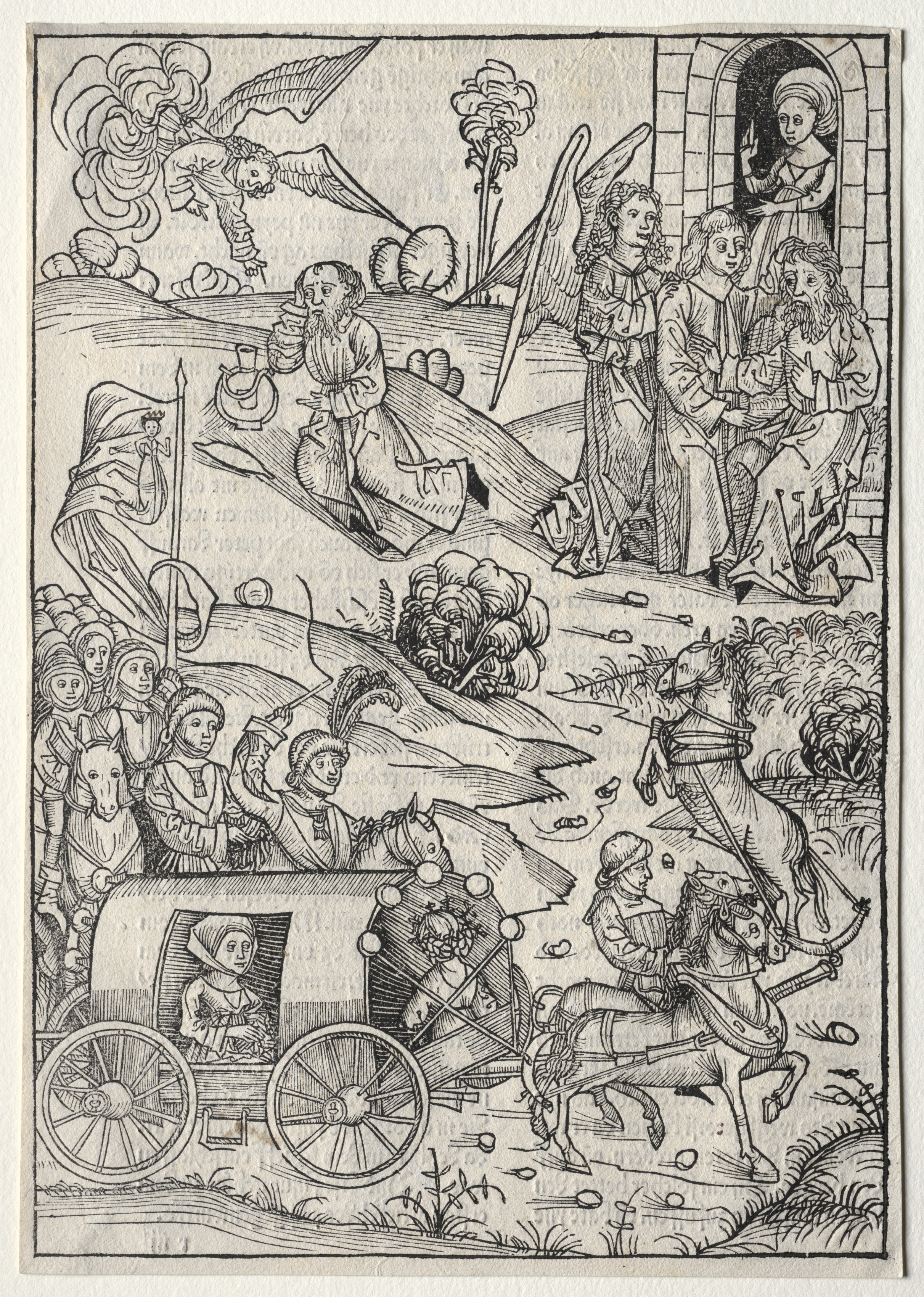 Black and white illustration on beige background. Three scenes stacked on top of each other. Top scene: angel with wings flying above a kneeling man; angel holds staff; tree and bushes behind; woman standing in archway looking on. Middle scene: three people; man on right sits on chair; two people beside him; woman on right looks on through archway. Bottom scene: two horses; one rider on horse; rider holds bow; person on horse looks back; another man on horse; horse rears up; horse-drawn cart with two people; people on horseback and on foot watch; trees and bushes behind.