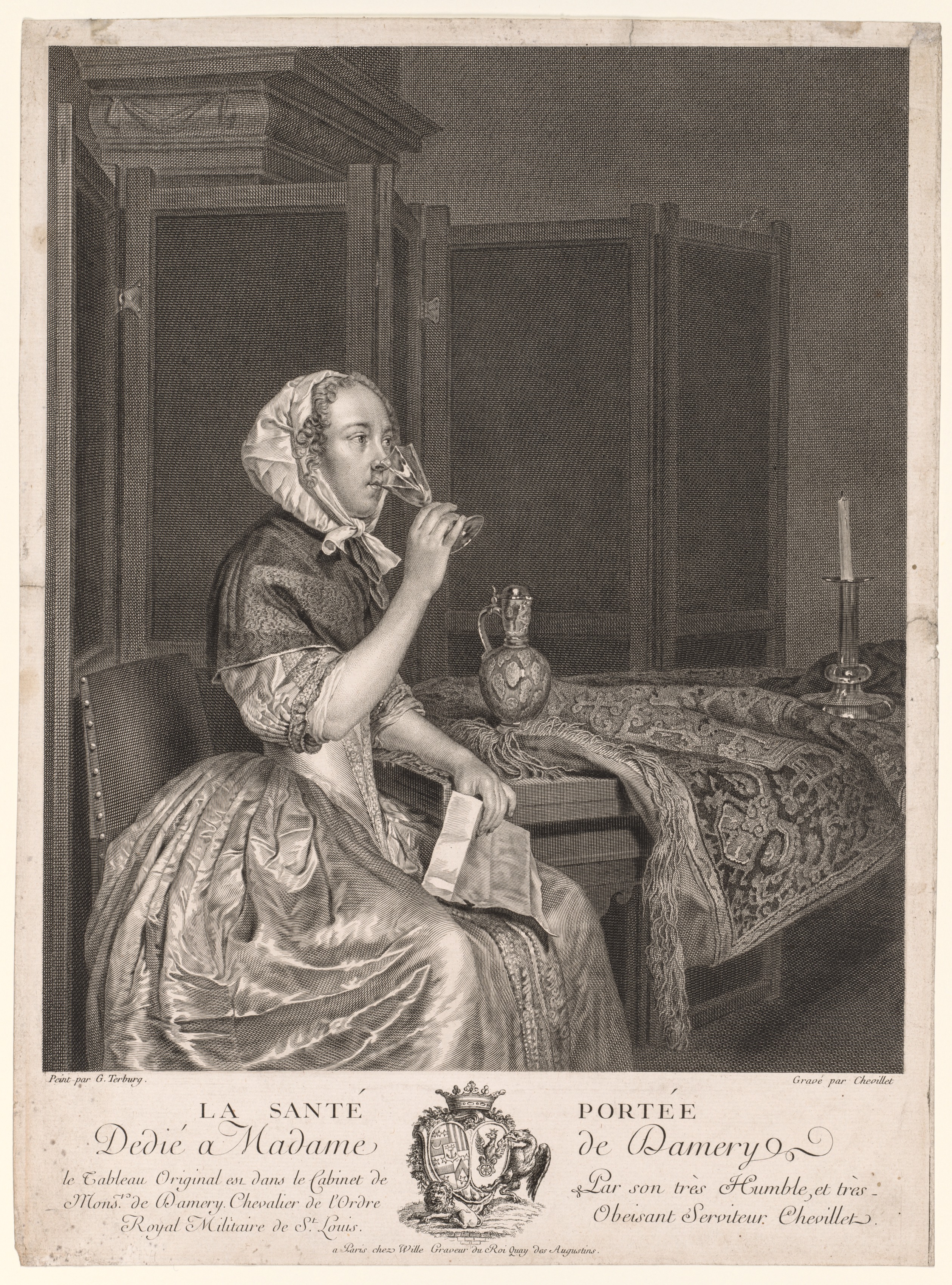 The image shows a black and white engraving of a woman in 18th-century clothing, sitting on a chair. The woman sits on the left side, wearing a dress with puffy sleeves, and a bonnet on her head. She holds a small glass up to her mouth with her right hand and a folded paper in her left hand. The woman sits on a chair with a table on the right. The table holds a jug and a candleholder with a white candle. The table has a decorative cloth on it. Behind the woman there are wooden shutters on the wall. The engraving is in a rectangular shape with a border around it, and there is a coat of arms. There are several lines of text written in French at the bottom. The text reads "LA SANTE Dedie a Madame" on the left and "PORTEE de Damery" on the right. Overall, the scene seems to depict everyday life. The image is titled "Drinking a Toast" by Gerard ter Borch.