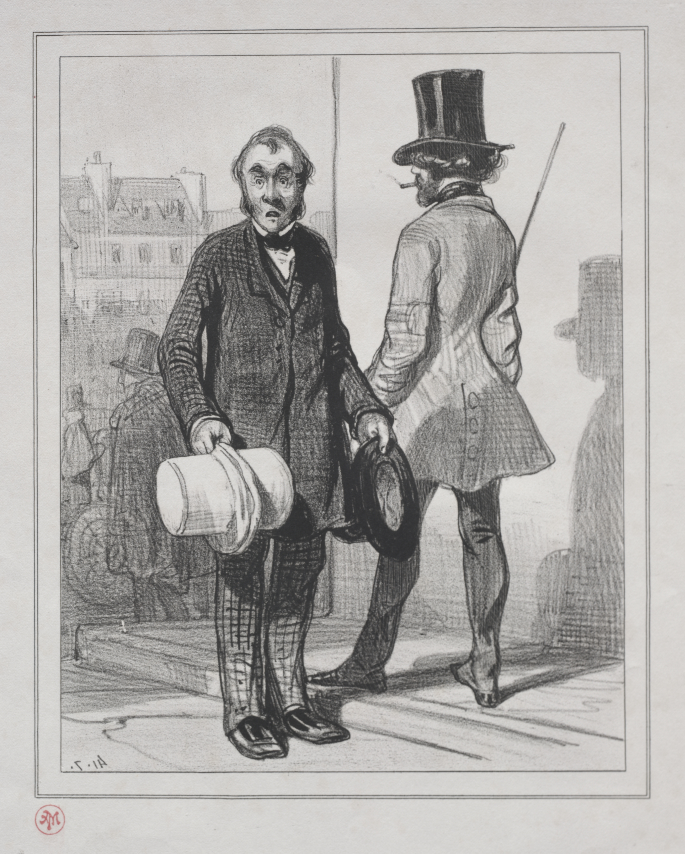 Black and white drawing of two men. The man on the left has thinning hair combed over the top of his head. He wears a dark three-piece suit, holds a top hat in each hand, and looks towards the viewer. The man on the right has a large beard and wears a light-colored three-piece suit with a top hat. He smokes a cigarette and faces away from the viewer. A city street scene is visible in the background. The work is titled "The Life of a Young Man" by Paul Gavarni.