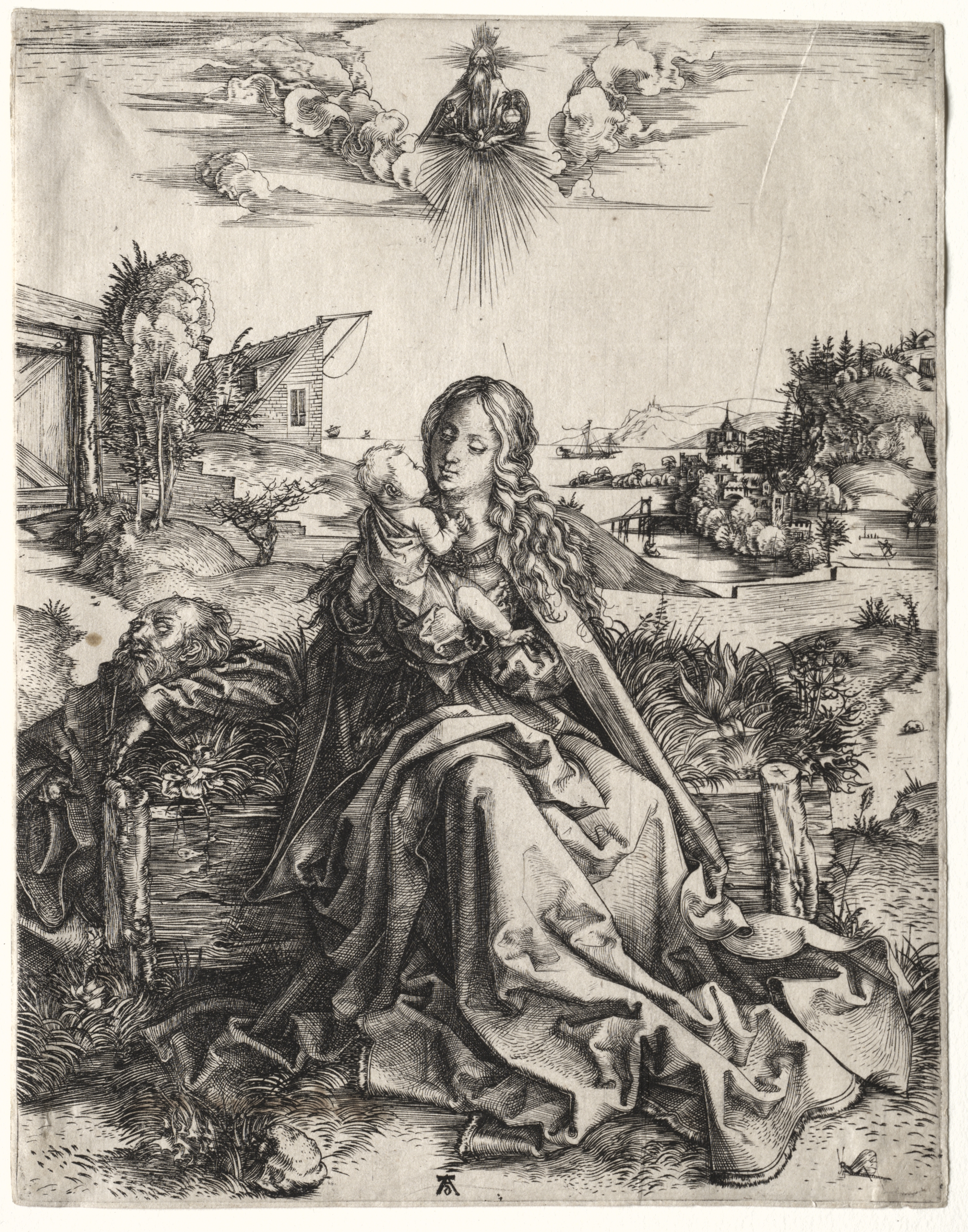 The Holy Family with the Butterfly by Albrecht Dürer: A black and white engraving depicting a woman sitting on a rock with a baby on her lap, accompanied by an older man to her left. The woman wears a long dress and has long wavy hair. The baby is naked and on her left breast. The older man has a long beard and wears a cloak. In the background, there are trees, a house on the left, and a body of water with buildings on the right. Above them, a dove is surrounded by rays of light and clouds. A butterfly rests on the woman's dress.