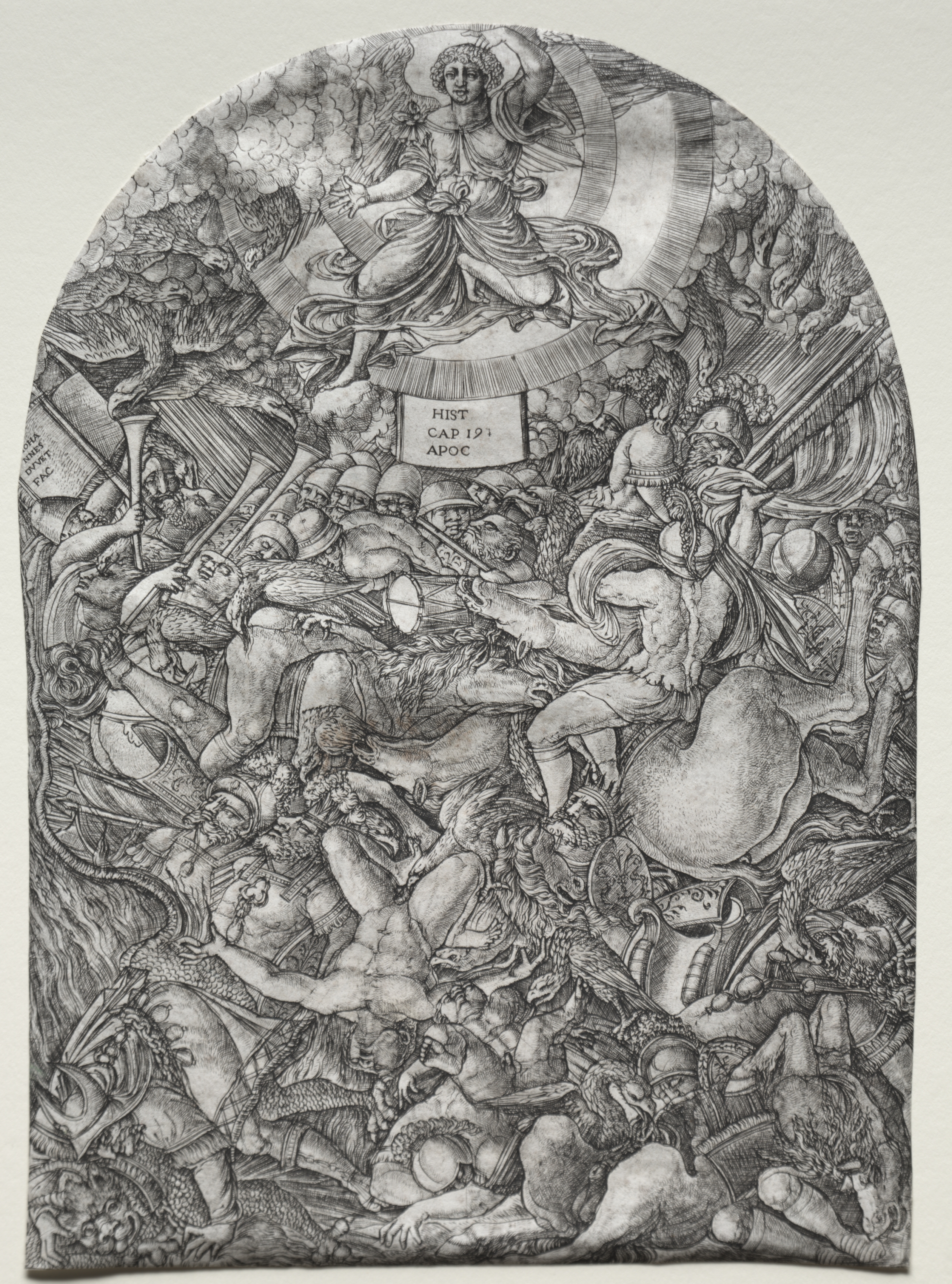 The image depicts a black and white drawing of an apocalyptic scene. The drawing is in the shape of an arch. At the top, an angel sits on clouds, surrounded by a halo of light. The angel has curly hair and wears a flowing robe. The angel appears to be holding a scroll or banner with text that reads "HIST CAP 19 APOC". Below the angel, a chaotic battle scene unfolds. Several men on horseback and on foot are engaged in combat. Some of the men wear helmets and carry swords, shields, and spears. The men are dressed in various types of clothing, including loincloths and capes. Some of the figures are humanoid, while others appear to be hybrid creatures with animal features, such as horns, wings, or beaks. The background of the drawing features clouds and smoke. The overall atmosphere of the image is one of intense conflict and destruction.