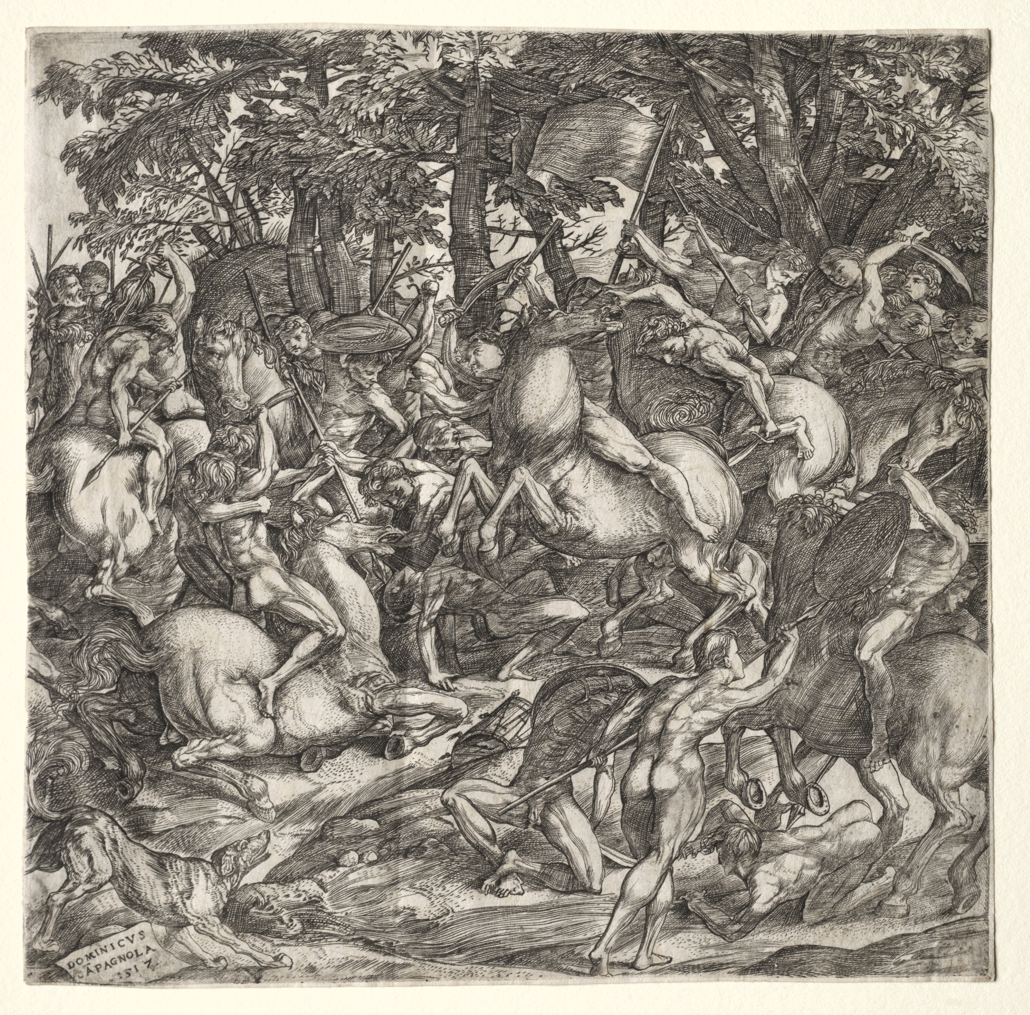 The image depicts a chaotic scene of a battle. Several nude men on horseback and on foot are engaged in combat. The men are armed with spears and shields. A few of the men are on the ground. Some horses are rearing up on their hind legs. The background shows trees, suggesting the battle takes place in a wooded area. The overall composition is dense and dynamic. The image is in shades of gray, suggesting it may be an engraving or etching. The title of the piece is "Battle of Naked Men" and the artist is Domenico Campagnola.
