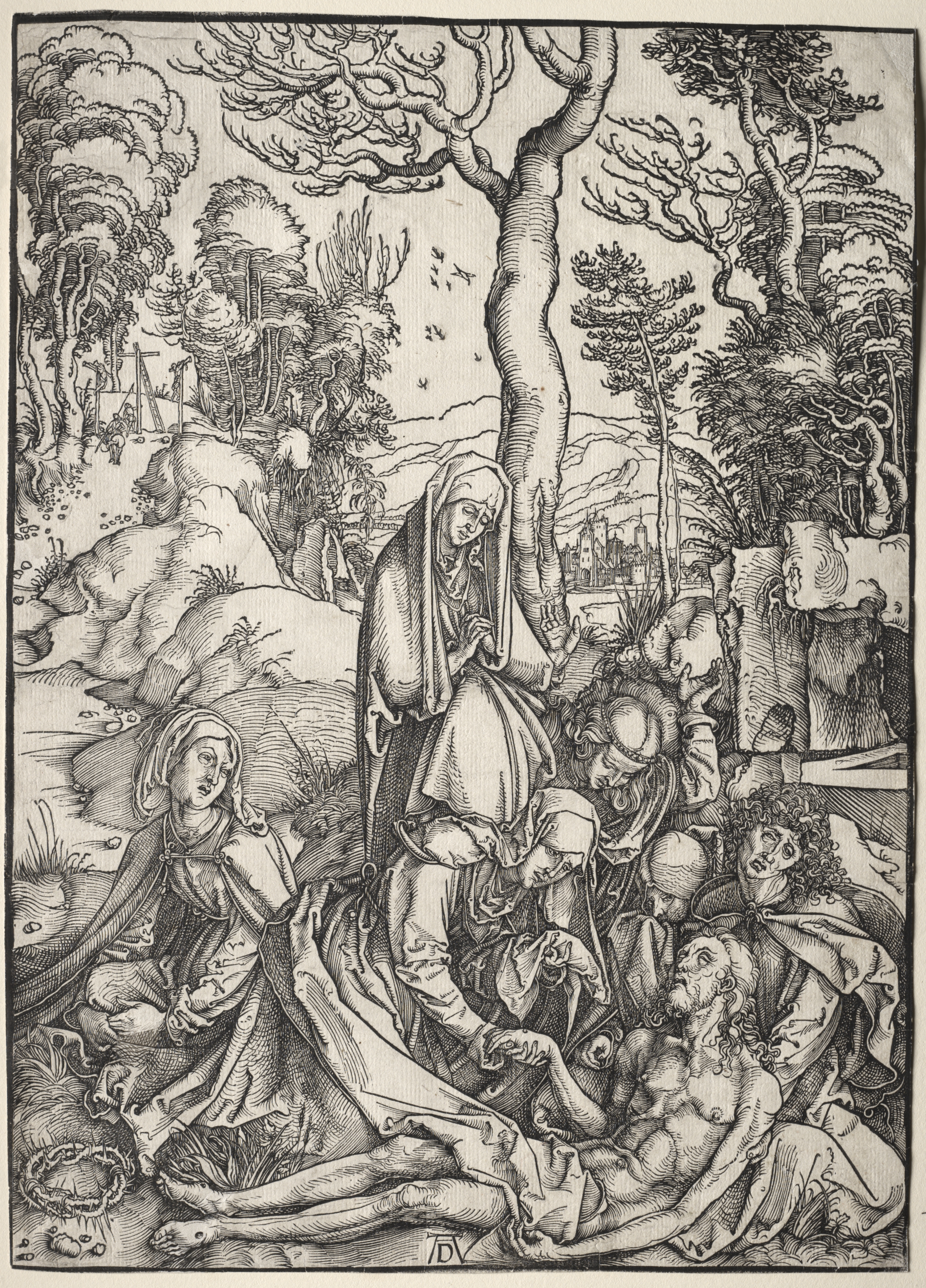 Black and white drawing of a scene with a central figure lying on the ground, surrounded by a group of people. The central figure is a man with long hair and a beard, no clothes on, on his back on the ground; one leg is bent at the knee. The people around him are dressed; one woman to his left on one knee; another woman standing over him with a hood; a man with curly hair to his right; and another man behind. In the background, a rocky landscape with trees; in the distance, a town and hills; a large tree trunk to the right and a large tree branch at top center; birds flying. The drawing is detailed with many lines; appears to be an engraving or woodcut; aged paper color; thin black border; monogram "AD" at bottom.