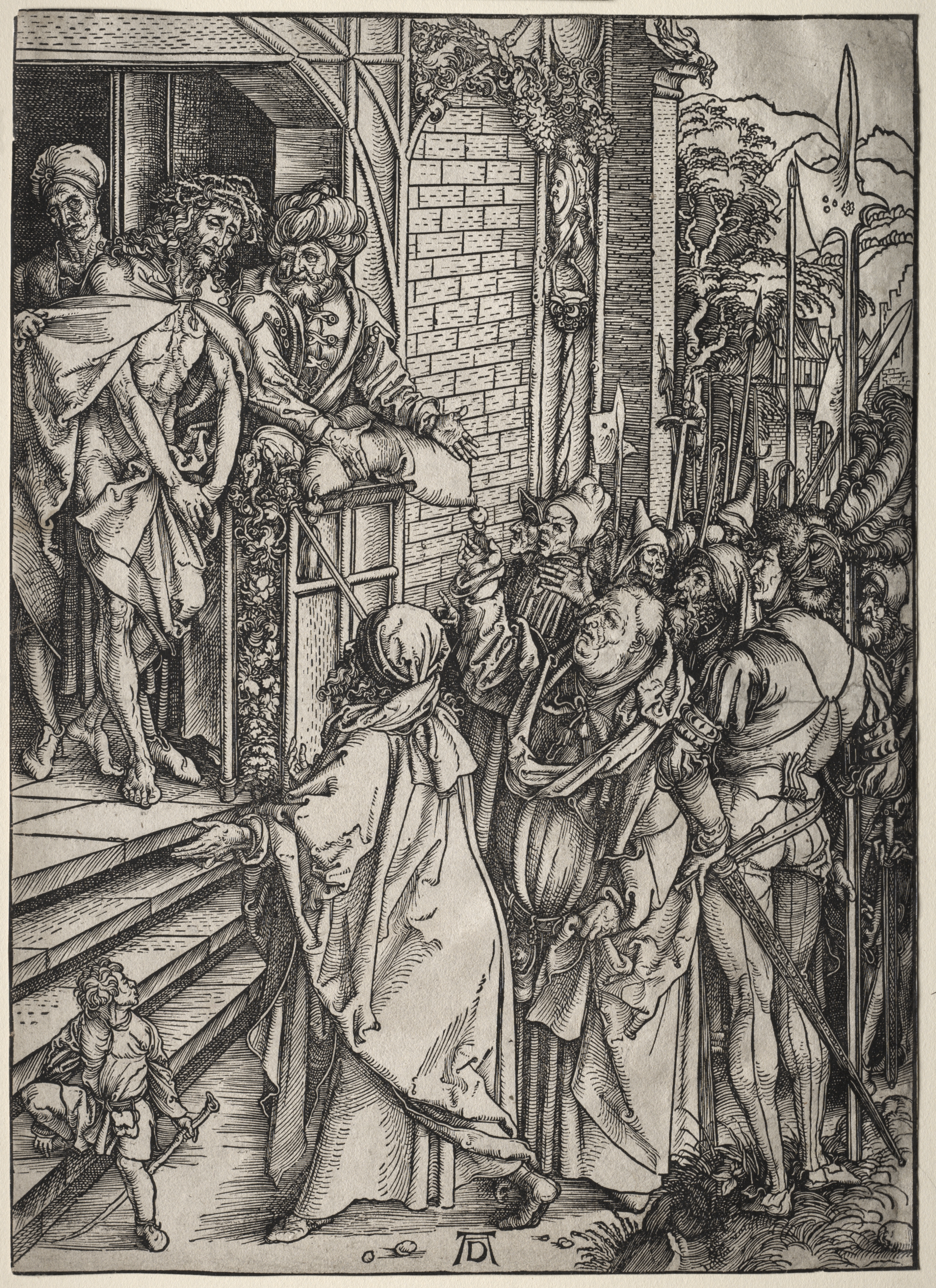 Black and white image. Christ, shirtless with a cloth covering his lower body, and a crown on his head, standing on steps. Two men behind him. A crowd of people to the right with spears, swords, and shields. Some men have turbans and others have head wraps. A man on the bottom step looking up. A man on the steps reaching out. A brick wall and tree on the right side. A pillar next to the brick wall. A garden element on the pillar.
