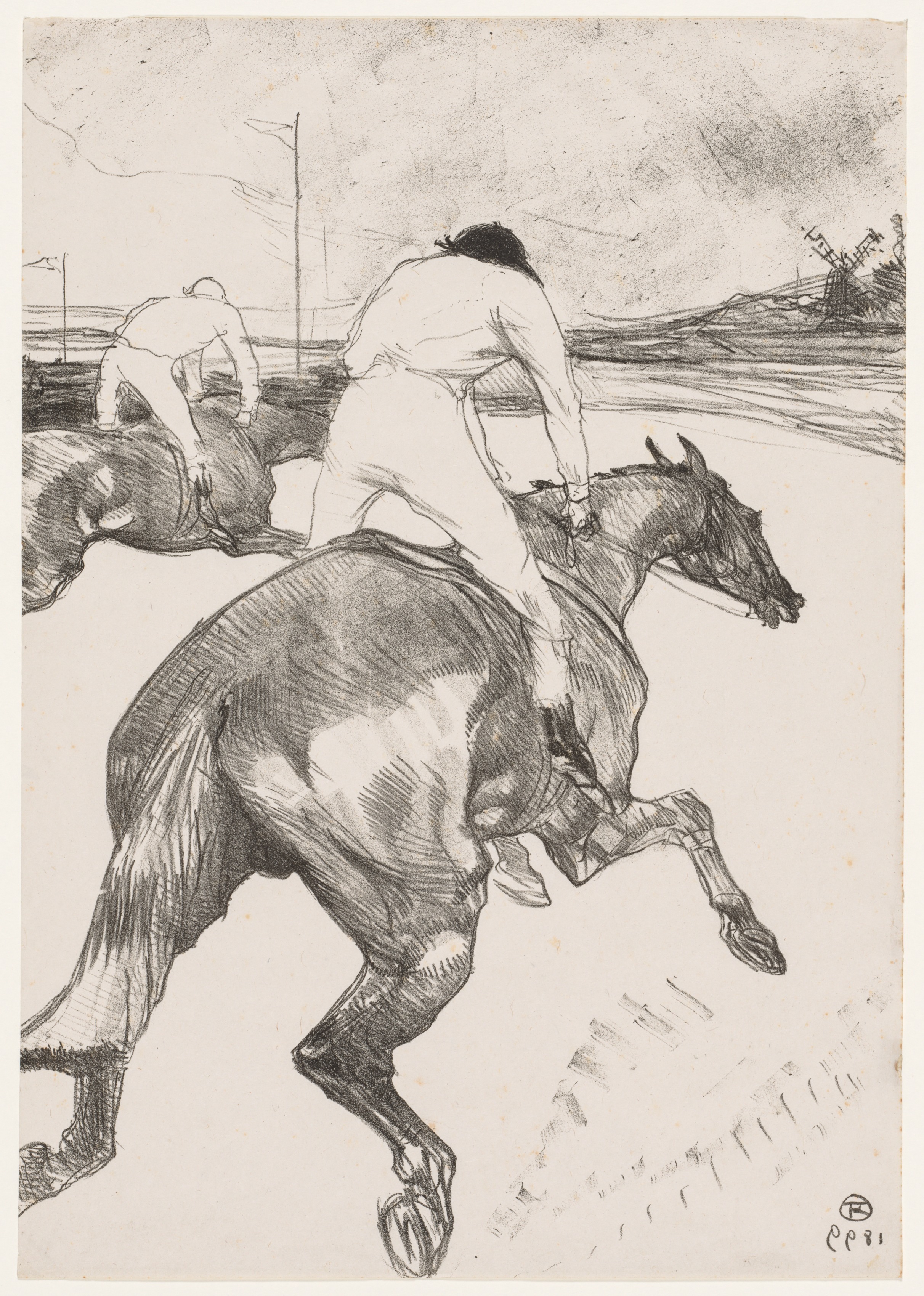 Black and white drawing of two jockeys riding horses. The drawing is titled 'The Jockey' by Henri de Toulouse-Lautrec. The lead jockey has dark hair and wears a white shirt and white pants. He rides a dark-colored horse that is mid-gallop with its front right leg lifted off the ground and its back left leg extended behind it. A second jockey and horse are in the background, slightly to the left and behind the lead pair. The jockey is leaning over the neck of the horse, and both appear to be on a racetrack. The background shows a cloudy sky, distant hills, and several flagpoles. The artwork is signed in the bottom-right corner.