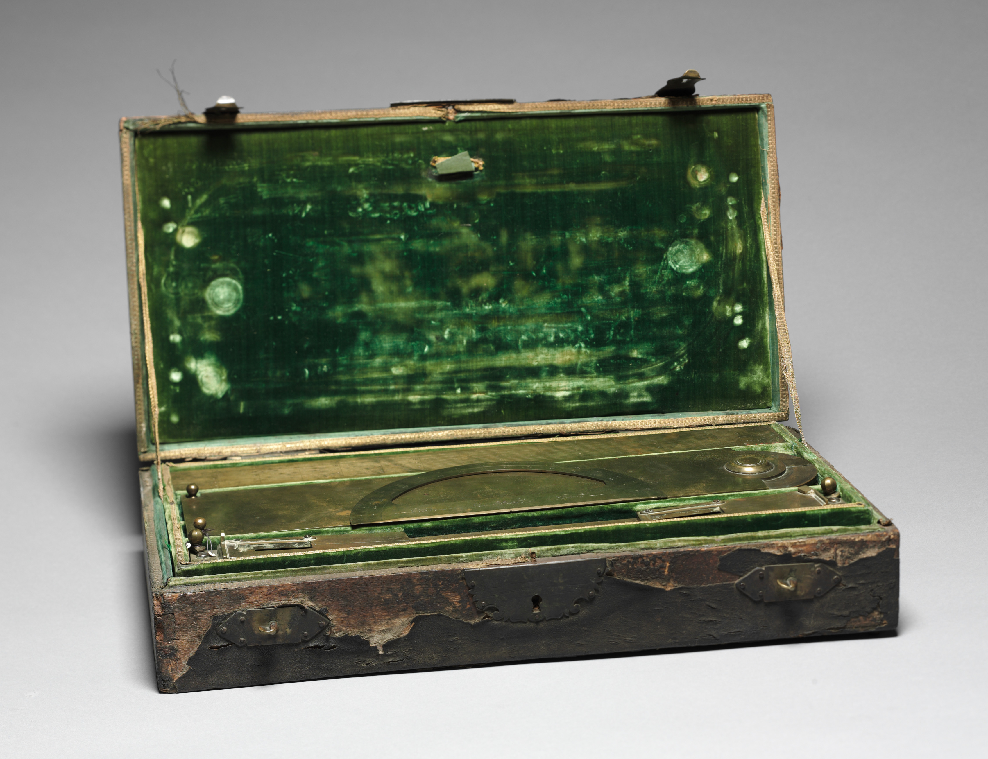 Rectangular box with lid open, made of dark brown wood, with green velvet interior. The box's exterior shows signs of wear and tear, with peeling and chipped edges. Two small metal hinges are visible on the top, and a latch on the front. The interior features a green velvet lining with several small circular indentations. A tray inside the box holds a small, thin, rectangular metal object and a circular metal object. The background is a plain gray color. Title: Box of Architectural Instruments. Artist: Pre. Le Maire.