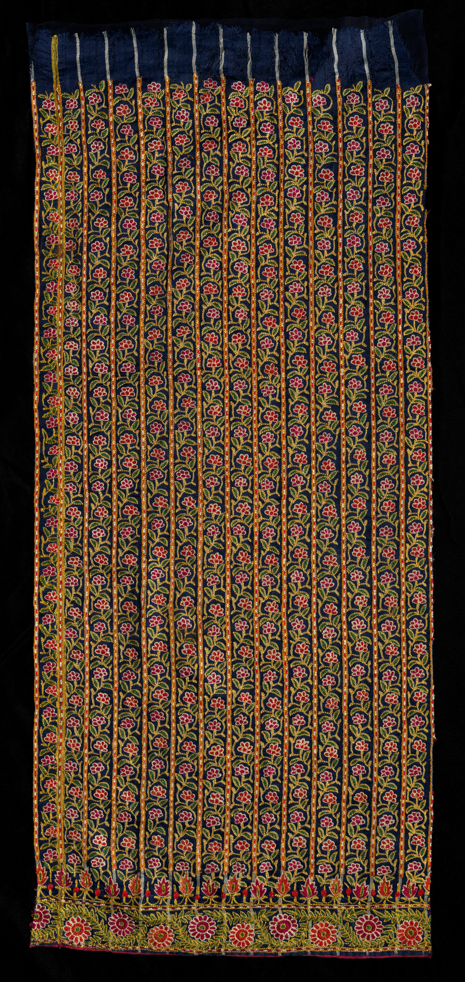 Part of a Skirt (Ghaghara) by unknown artist. Rectangular piece of fabric with a blue top section and a long, vertically striped lower section. The blue section is 2 inches deep with 7 thin white lines running across the fabric parallel to one another. The lower section has 11 yellow stripes with floral embroidery. The floral embroidery on the yellow stripes consists of repeating patterns of pink and red flowers with green stems and leaves on a black background. The bottom of the fabric has a thicker band of floral embroidery. The floral embroidery on the bottom band consists of pink and red flowers with green stems and leaves on a yellow background. The fabric is set against a black background.